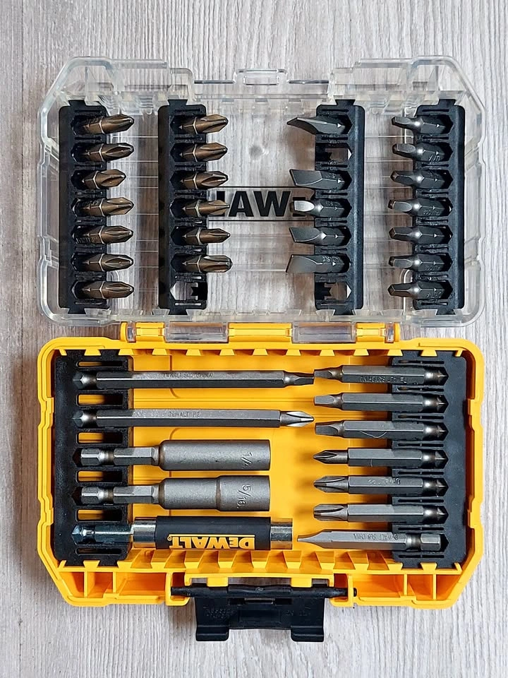 DeWalt Screwdriver Bit Set with ToughCase+ System. Includes 1/4" and 5/16" socket drivers, a magnetic drive guide, as well as Philips, flathead, and Robertson bits. Barely used, all bits present, bought at $50.