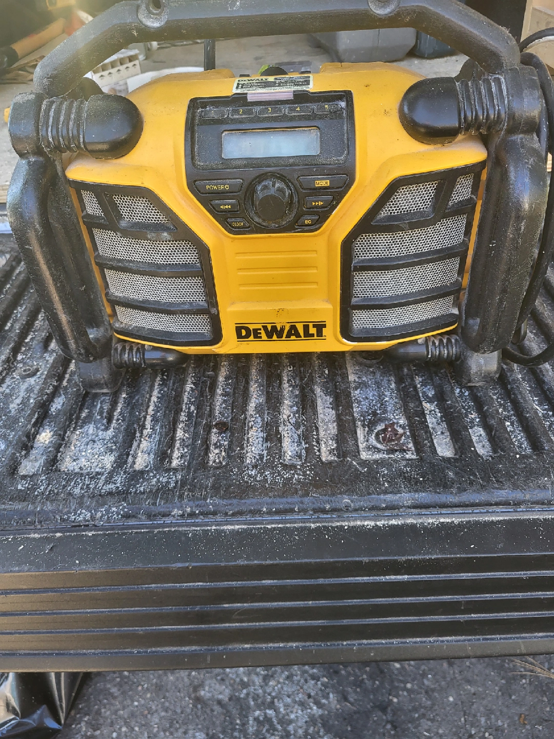 Selling a Dewalt radio. It's yellow and black. Has a power button, mode, clock and EQ button. also can work off a 20 v battery really great working radio and has aux cable for phone or blue tooth adapter