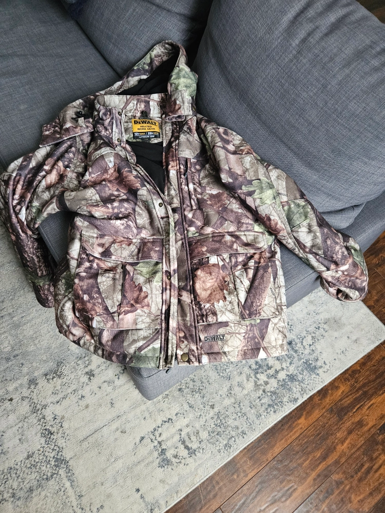 10Men's hunting jacket. Realtree camouflage pattern. Full zip closure. Hooded. Multiple pockets. Durable material. Battery, adapter and charger included.