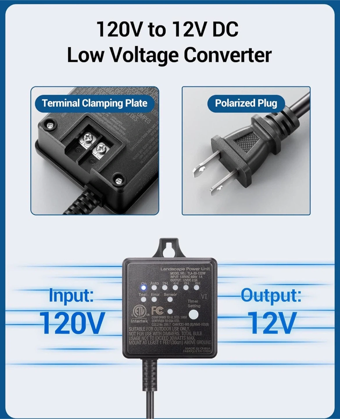 205Selling a DEWENWILS 30W outdoor low voltage transformer. It has a timer and photocell light sensor, converting 120V AC to 12V DC. It's weatherproof and specially designed for LED landscape lighting, spotlights, and pathway lights. It's ETL listed and features dusk to dawn sensor, light sensor countdown, and indoor/outdoor compatibility