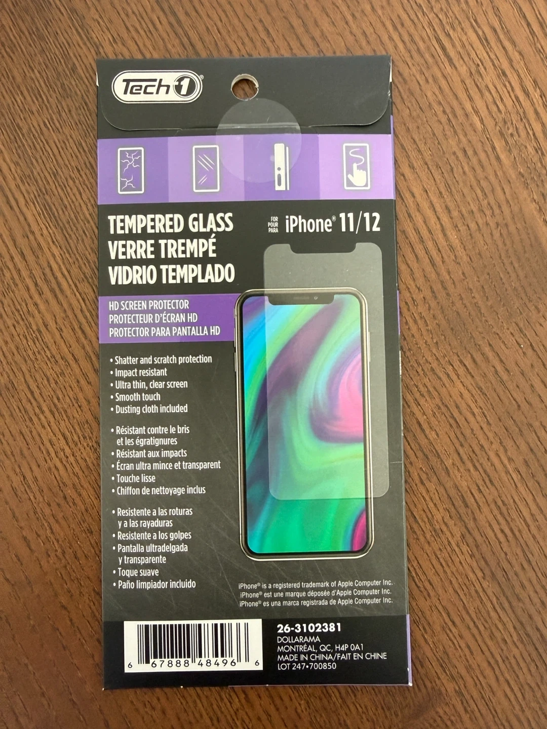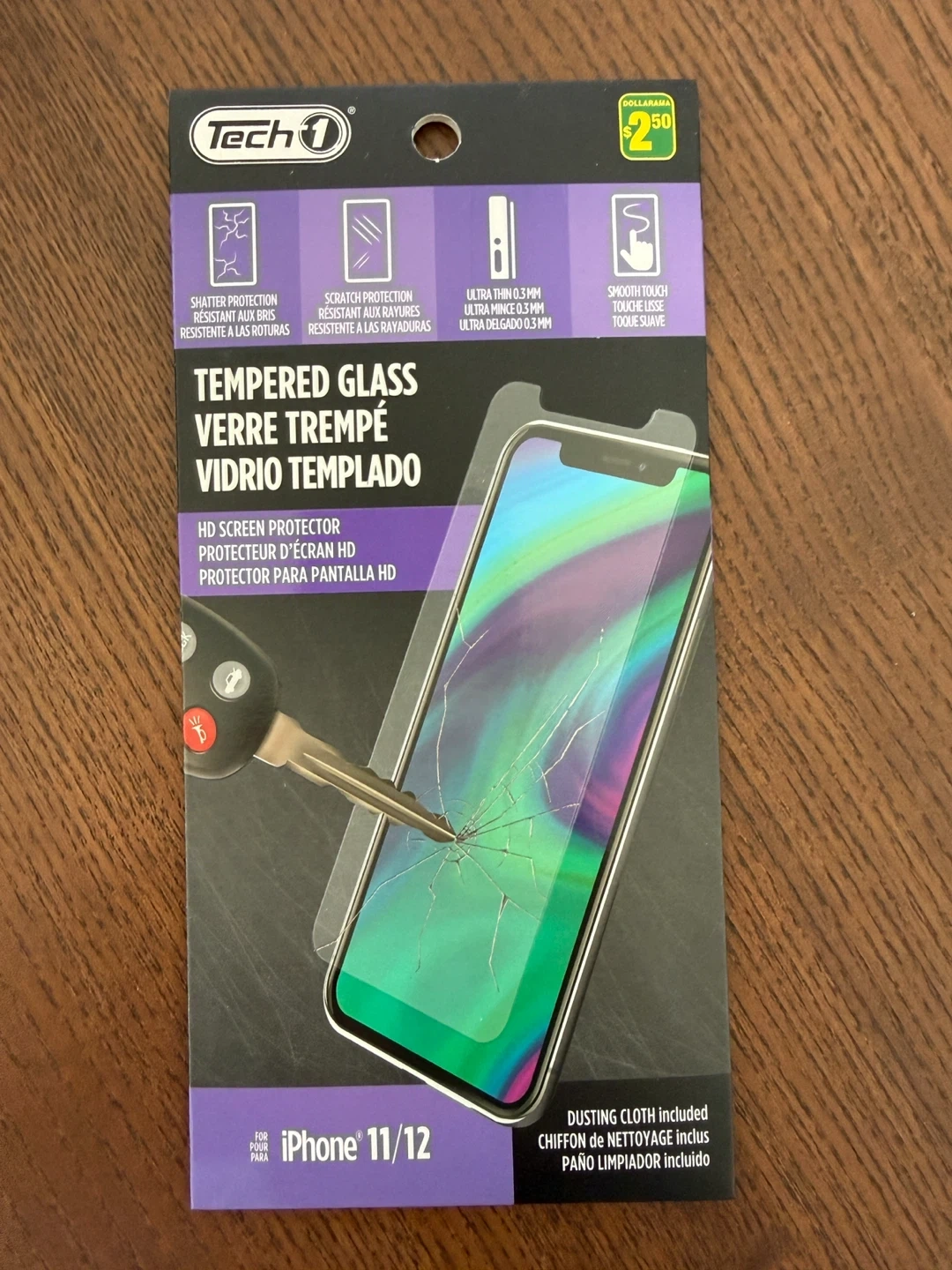 This is a Tech 1 HD screen protector made of tempered glass for iPhone 11/12. It's shatter and impact resistant, ultra thin at 0.3 mm, and offers a smooth touch. A dusting cloth is included.