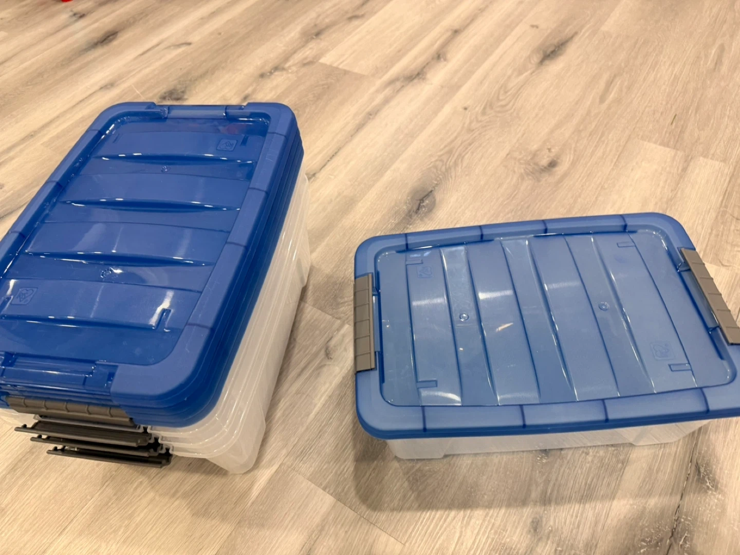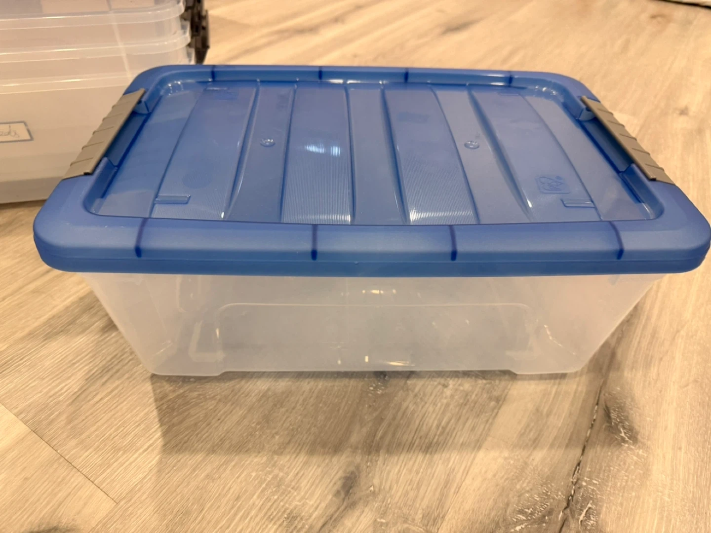 This is a clear plastic storage bin with a blue lid and grey latches. It's suitable for organizing various items. The bin is made of durable plastic. It's great for keeping garages, closets, or basements tidy!