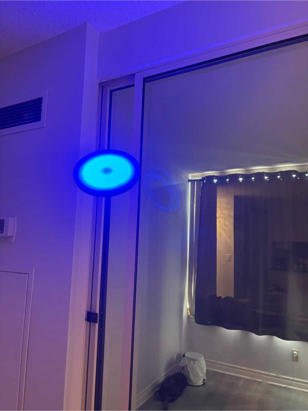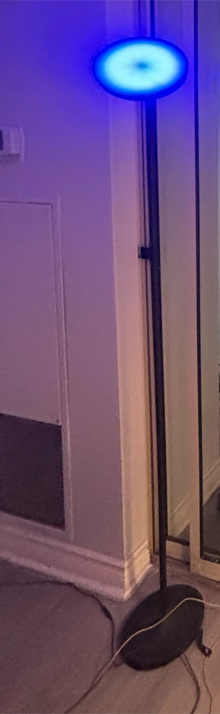 Modern black floor lamp with a circular blue LED light. Its slim design makes it a great addition to any room. Stands tall with a stable base.