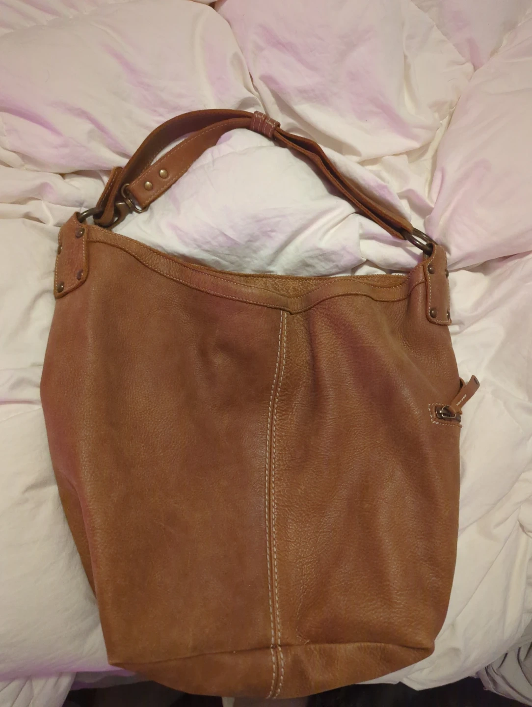 This is a brown leather shoulder bag from Roots. It features a soft, distressed leather exterior with contrast stitching. The interior has a zippered pocket.