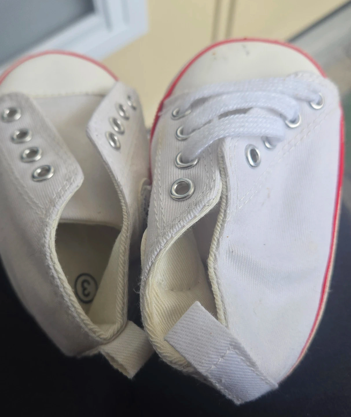 White canvas high-top baby shoes with red and blue accents. Elastic laces and hook-and-loop closure for easy on and off. Size 3 indicated inside.
