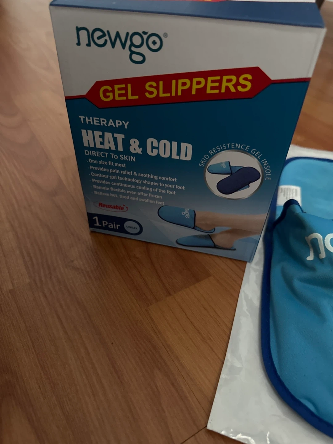 Newgo therapy gel slippers for heat and cold treatment. One size fits most and they're reusable. Provides pain relief and soothing comfort for your feet.