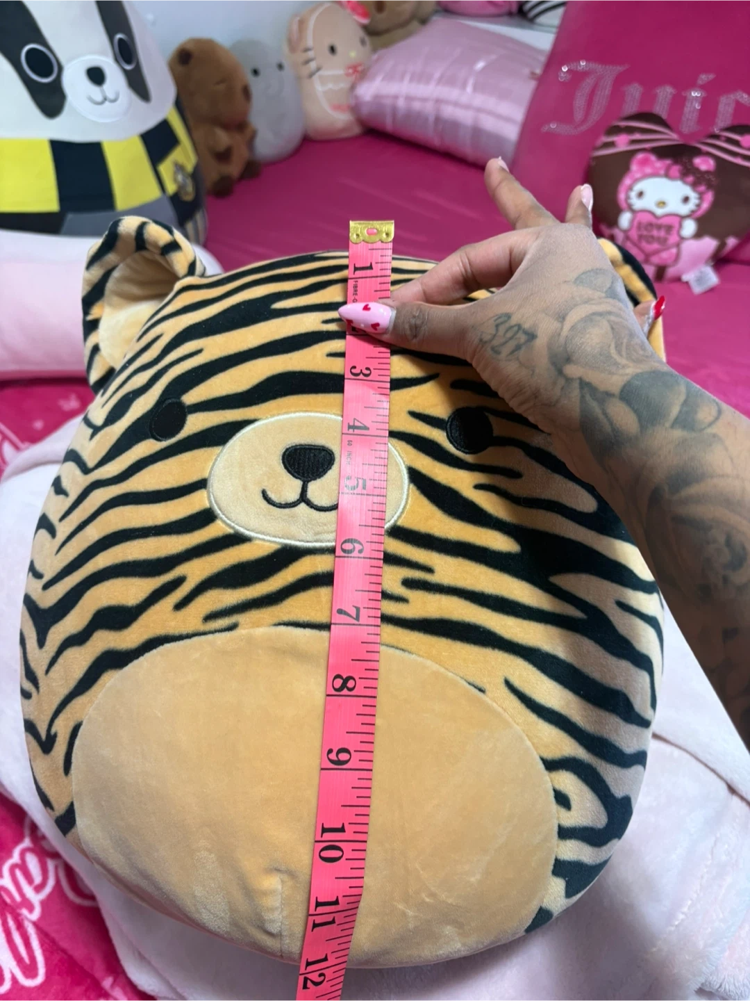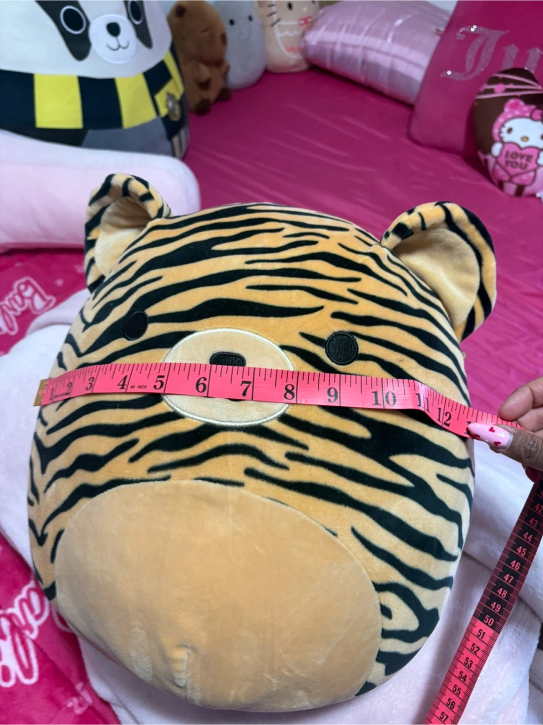 This is a Squishmallow tiger plush. It's a soft, round stuffed animal perfect for cuddling. Measurements indicate it's about 8 inches tall. It's a fun addition for any plush collector!