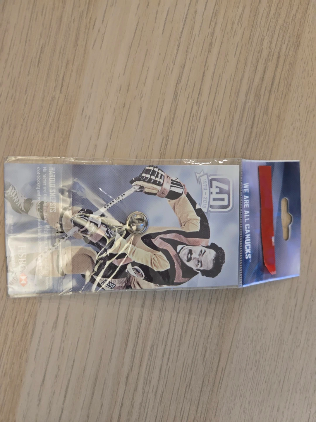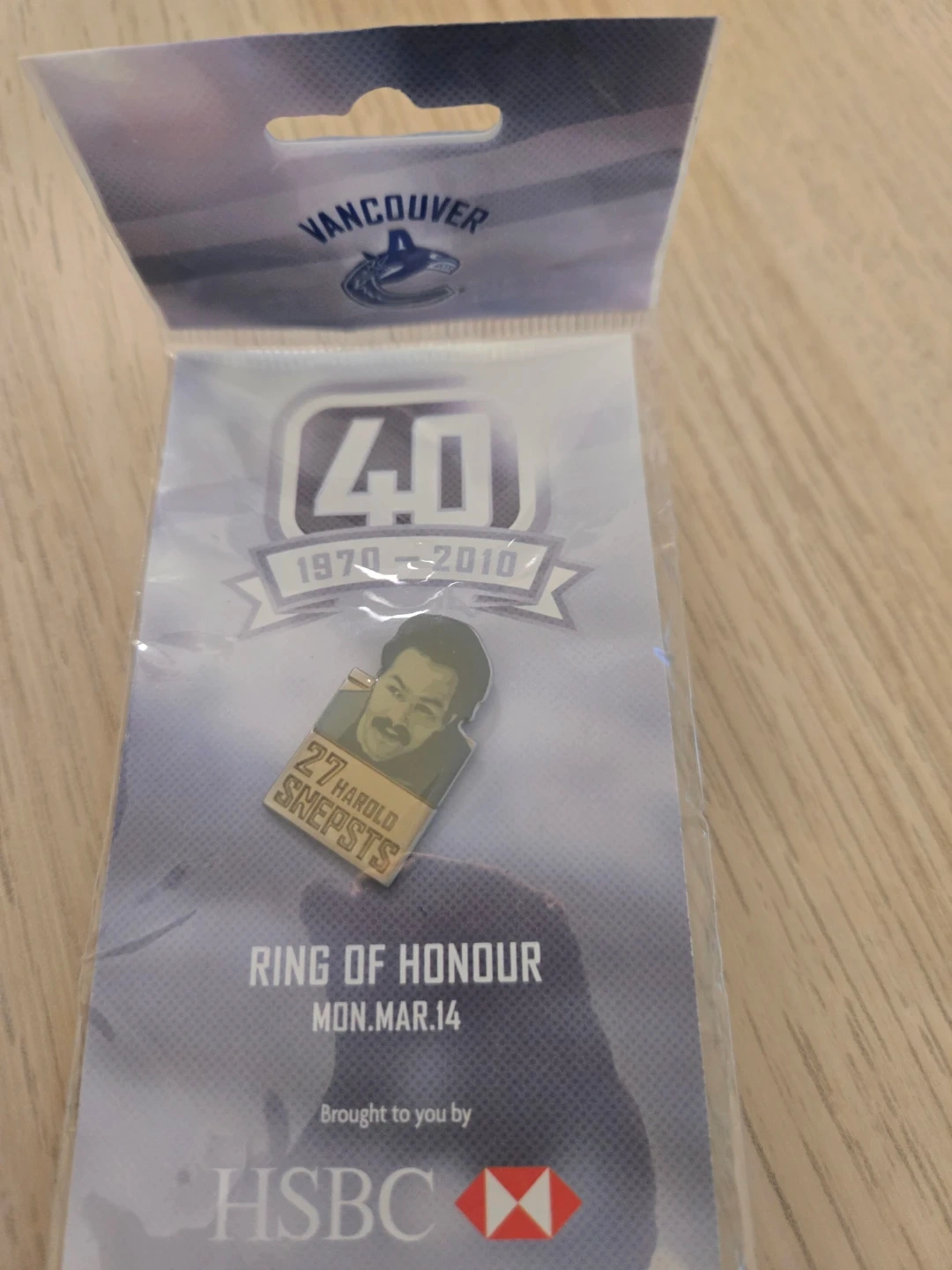 This is a Vancouver Canucks Harold Snepsts Ring of Honour pin from the 2010 season. It celebrates the 40th anniversary of the team. The pin is still in its original packaging. It was brought to you by HSBC.