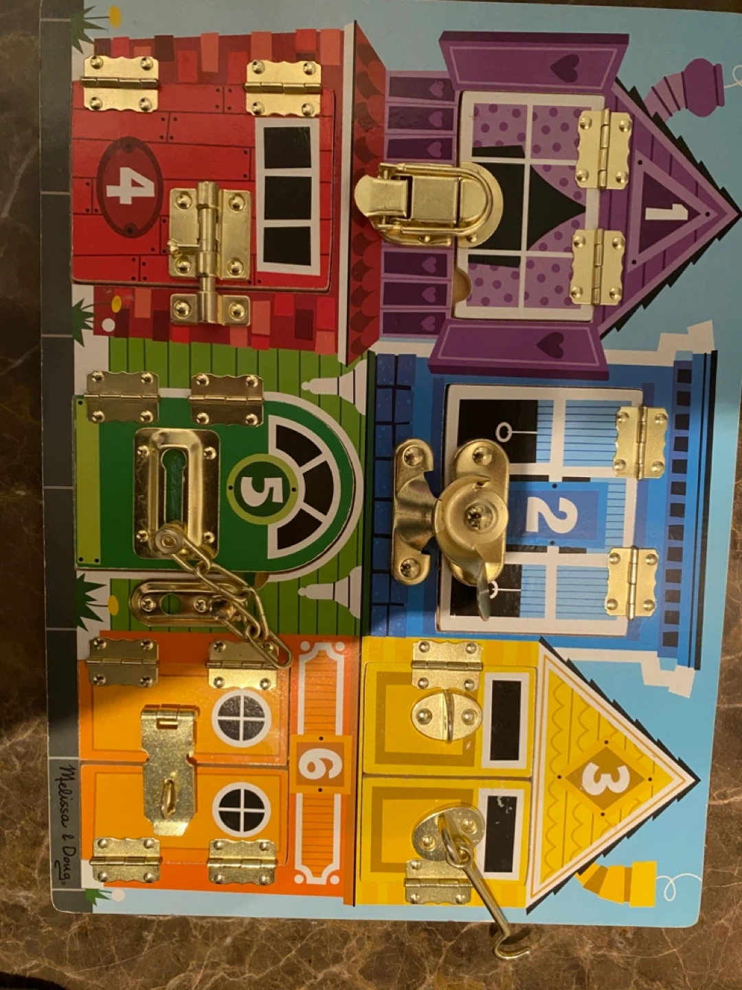 This activity board features four colourful houses with different locks and latches. It's designed to help develop fine motor skills. Kids can practise using various latches and keys.