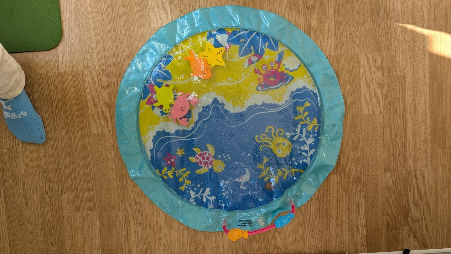 This inflatable water play mat features a fun underwater scene with sea creatures. It's perfect for sensory play and keeping little ones cool. The mat is made of durable PVC material.