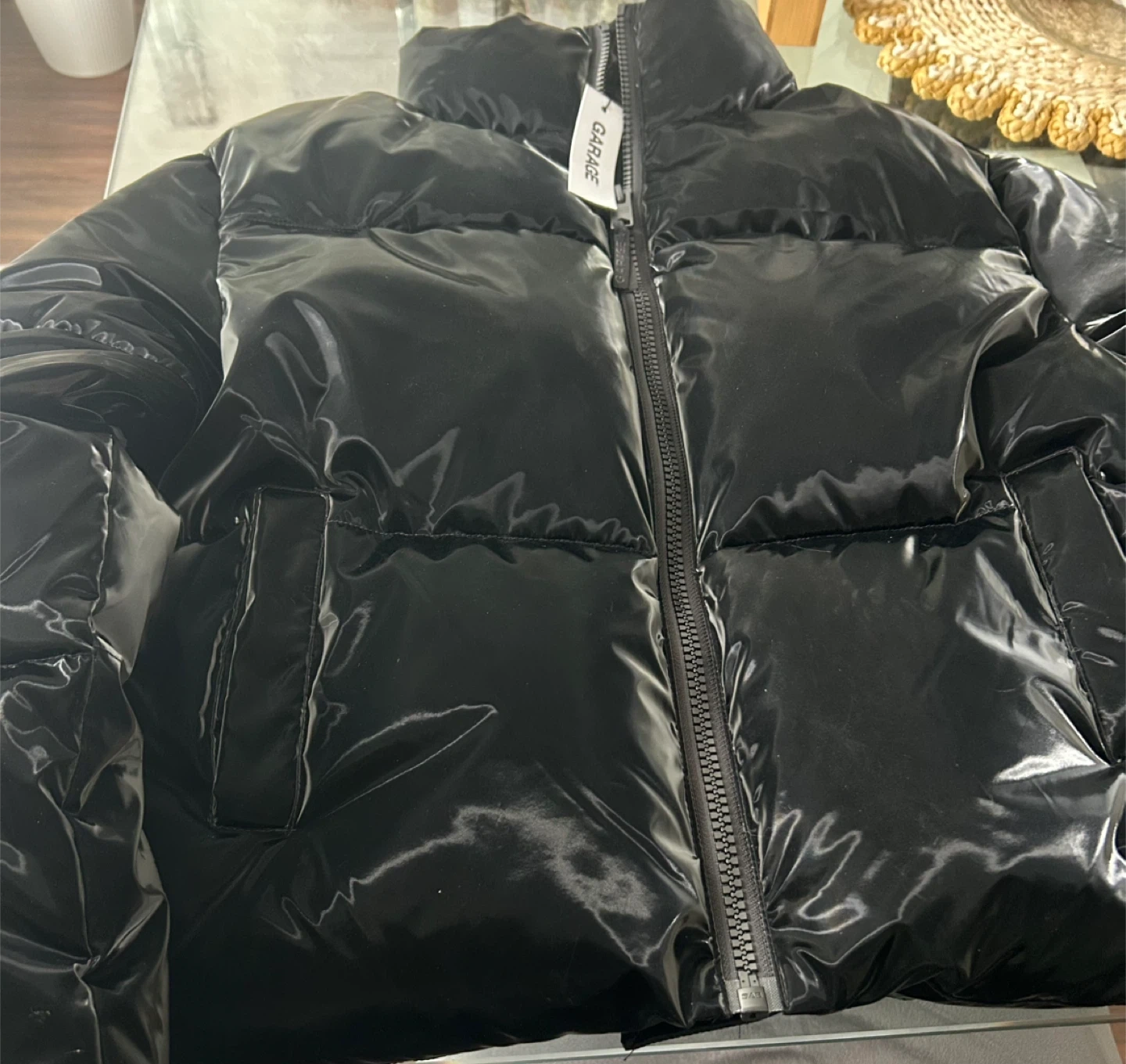 Shiny black puffer jacket from Garage. It's a size medium with a zip-up front and pockets. This jacket's glossy finish makes it a statement piece!