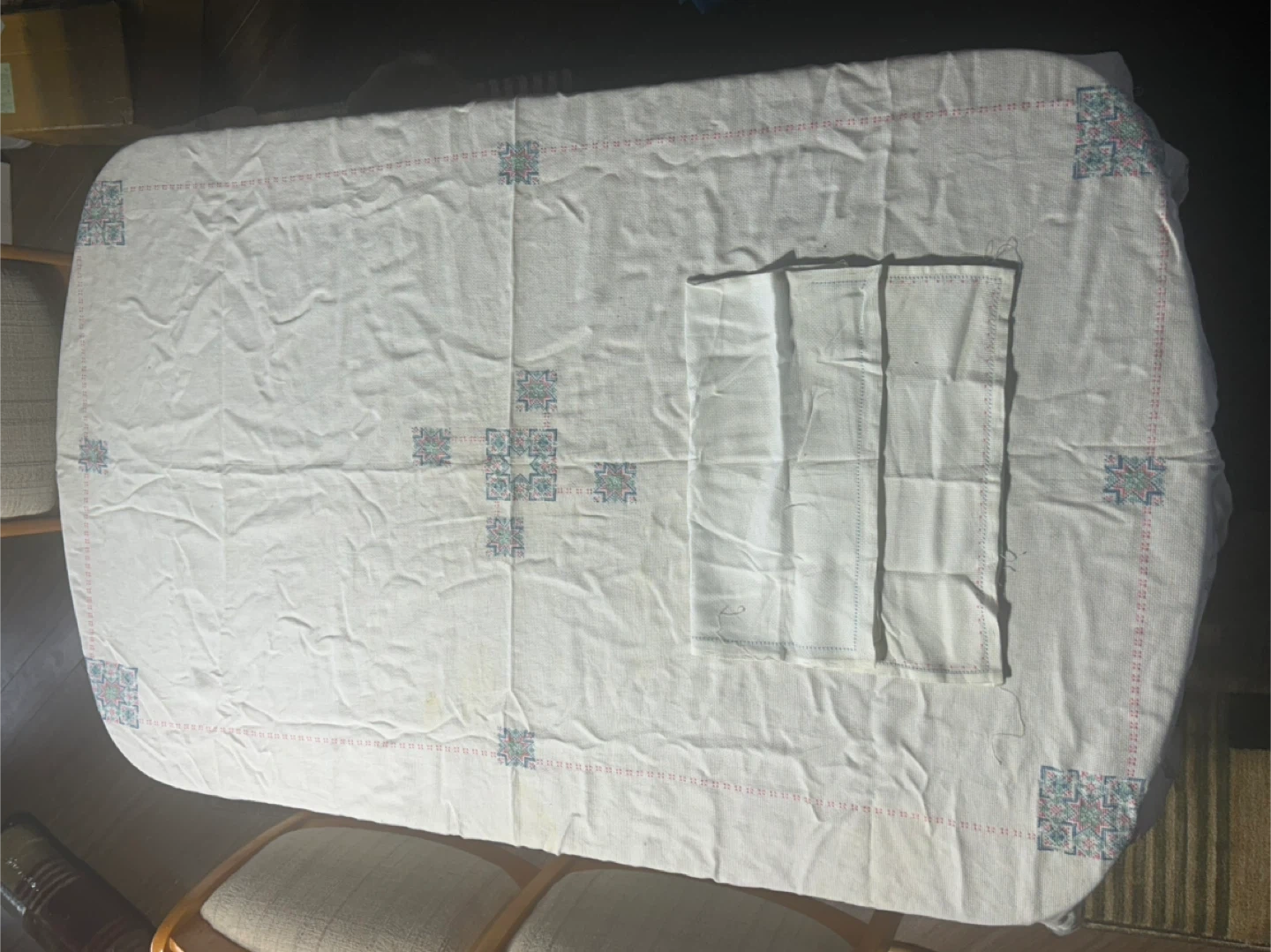 I'm offering a mostly finished, handmade embroidered tablecloth with matching napkins embroidery kit. This unique set features beautiful, intricate embroidery that adds a touch of elegance to any dining setting. It comes with everything needed to finish the embroidery project.
