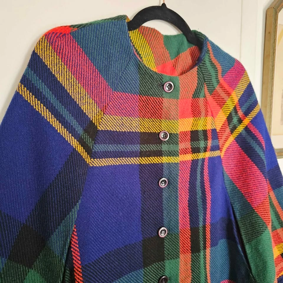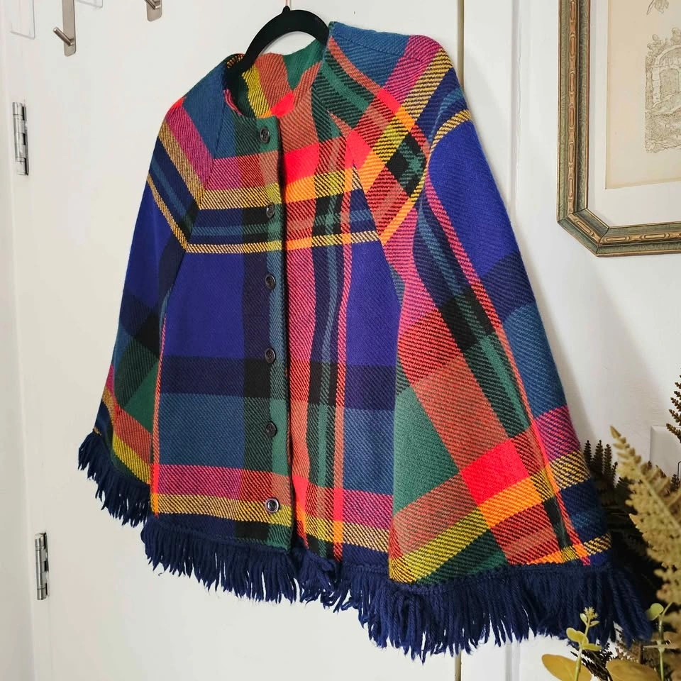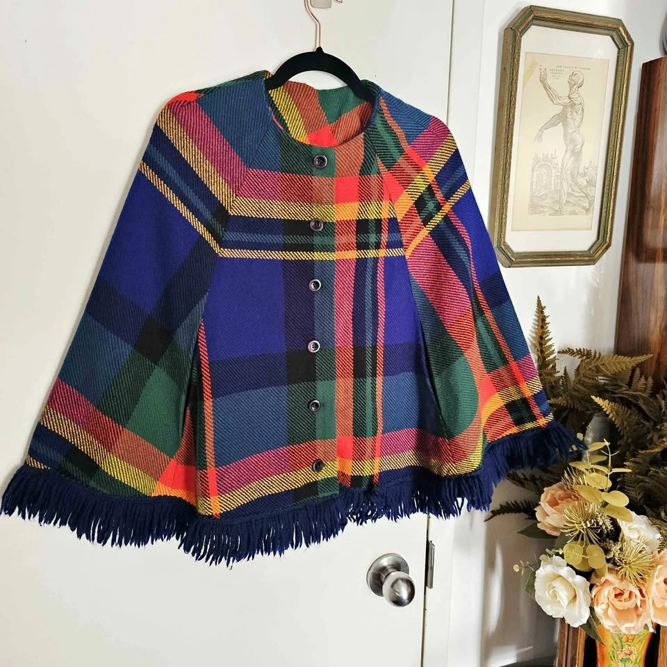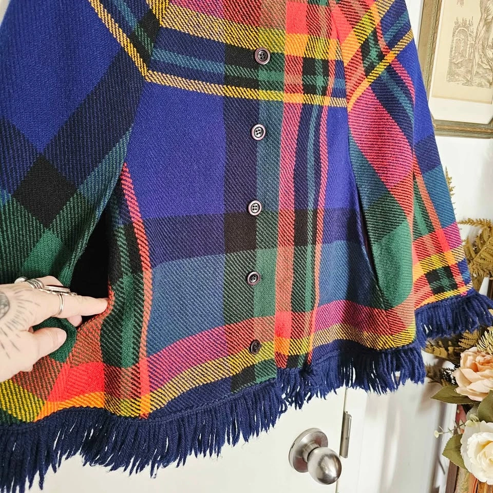 vintage cape 70s outerwear mod coat wool poncho fringe cape folk style statement coat retro plaid cottagecore spring fall transition outerwear boho vintage heritage wool