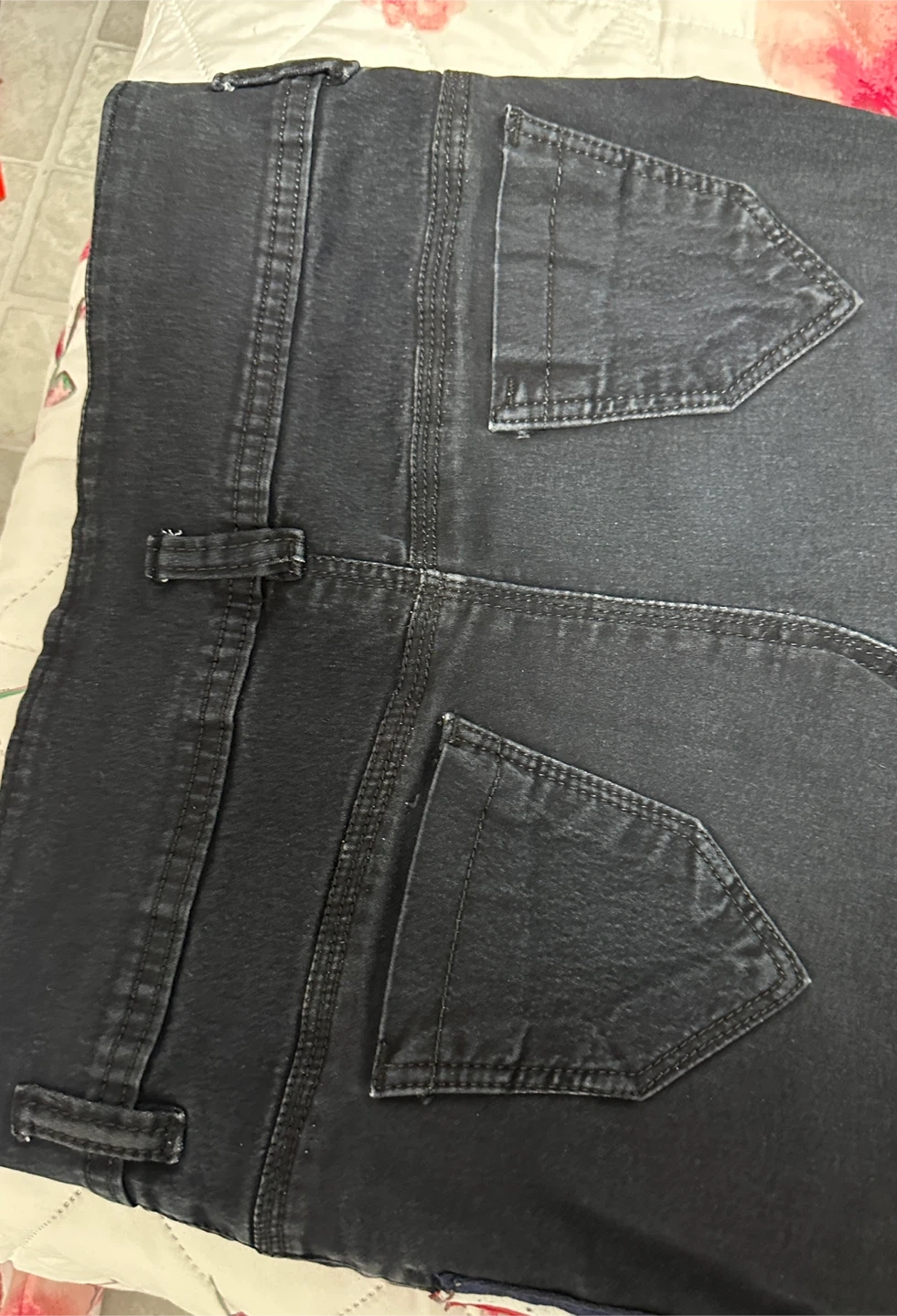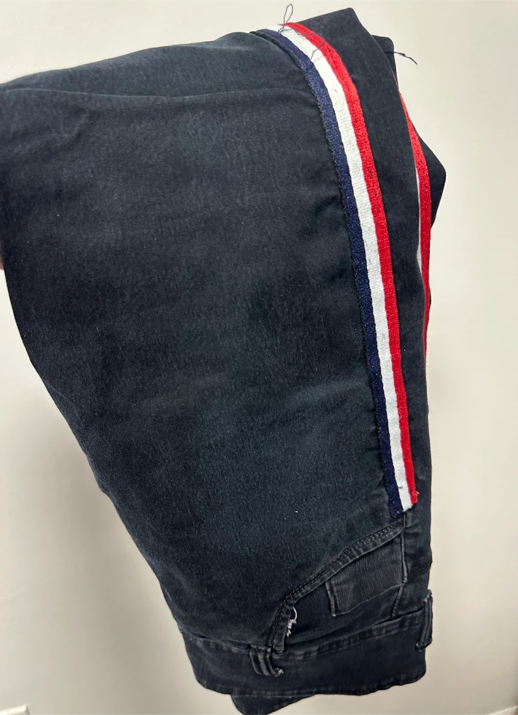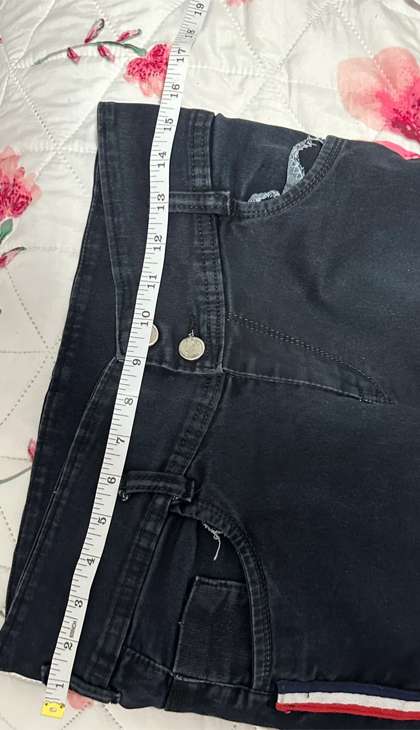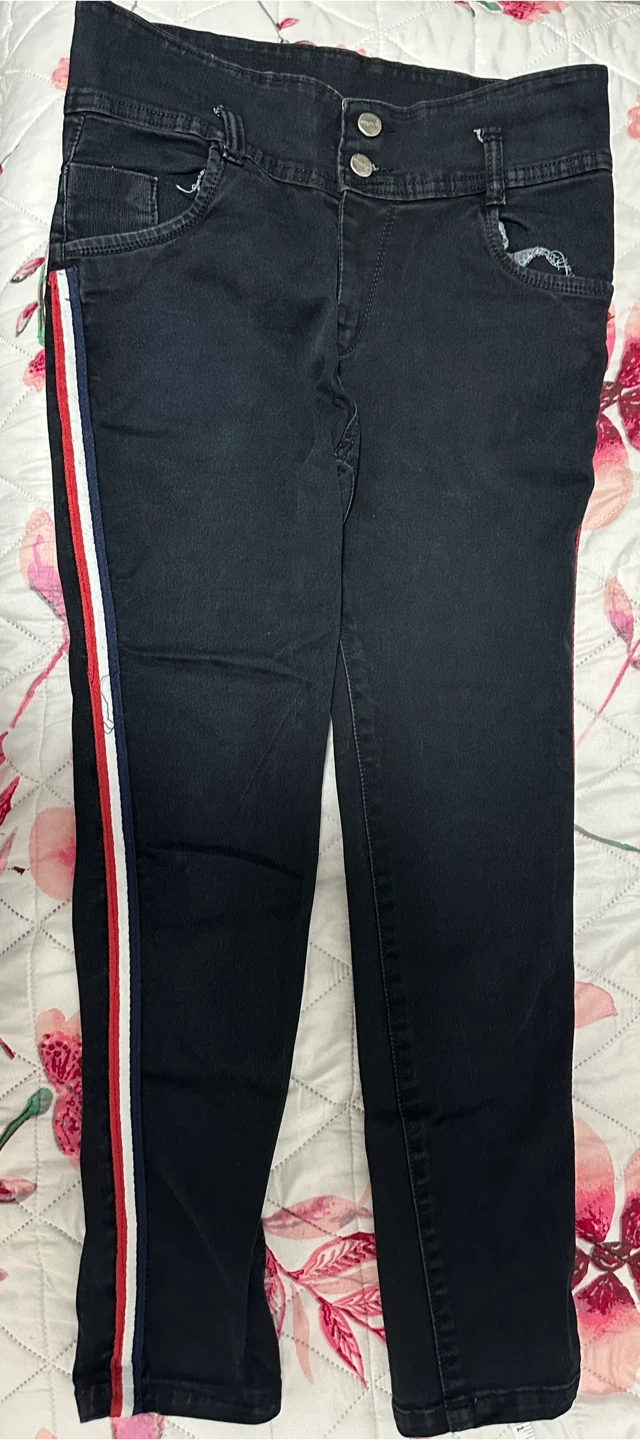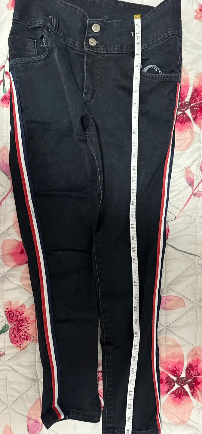 These black denim jeans feature a sporty red, white, and blue side stripe detail. They have a button fly closure and are made of a cotton blend for comfort. Inseam measures approximately 29 inches. Stylish dark wash jeans. High waisted with a two button closure. Has a cool red, white, and blue stripe down the side. Waist measures about 15-16 inches across when laid flat. Price is negotiable