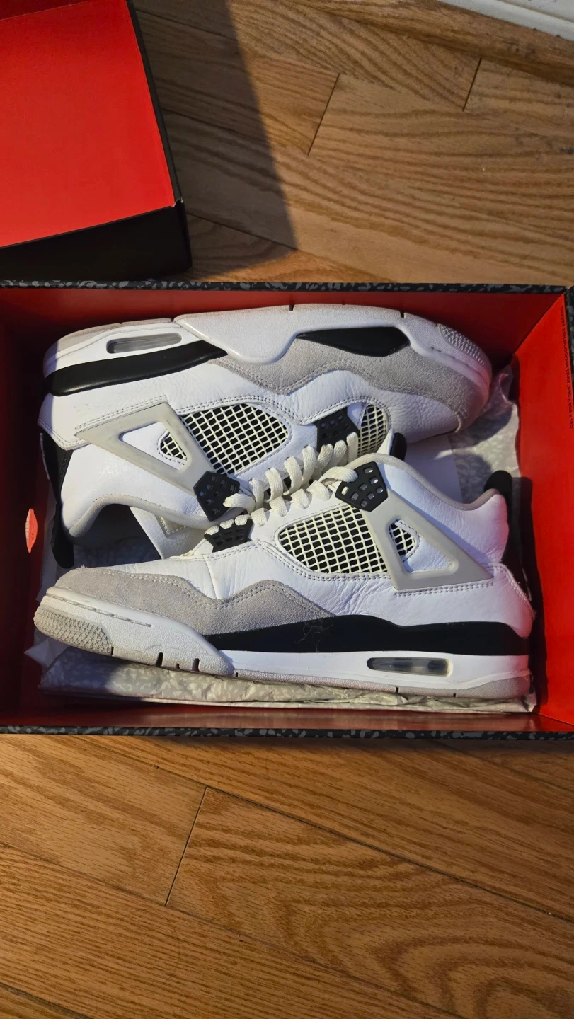 These Air Jordan 4 Retro sneakers come in a classic white and grey colourway. They feature a leather and suede upper with a mesh detail on the sides and tongue. The original box is included. These are a great addition for any sneaker collector!