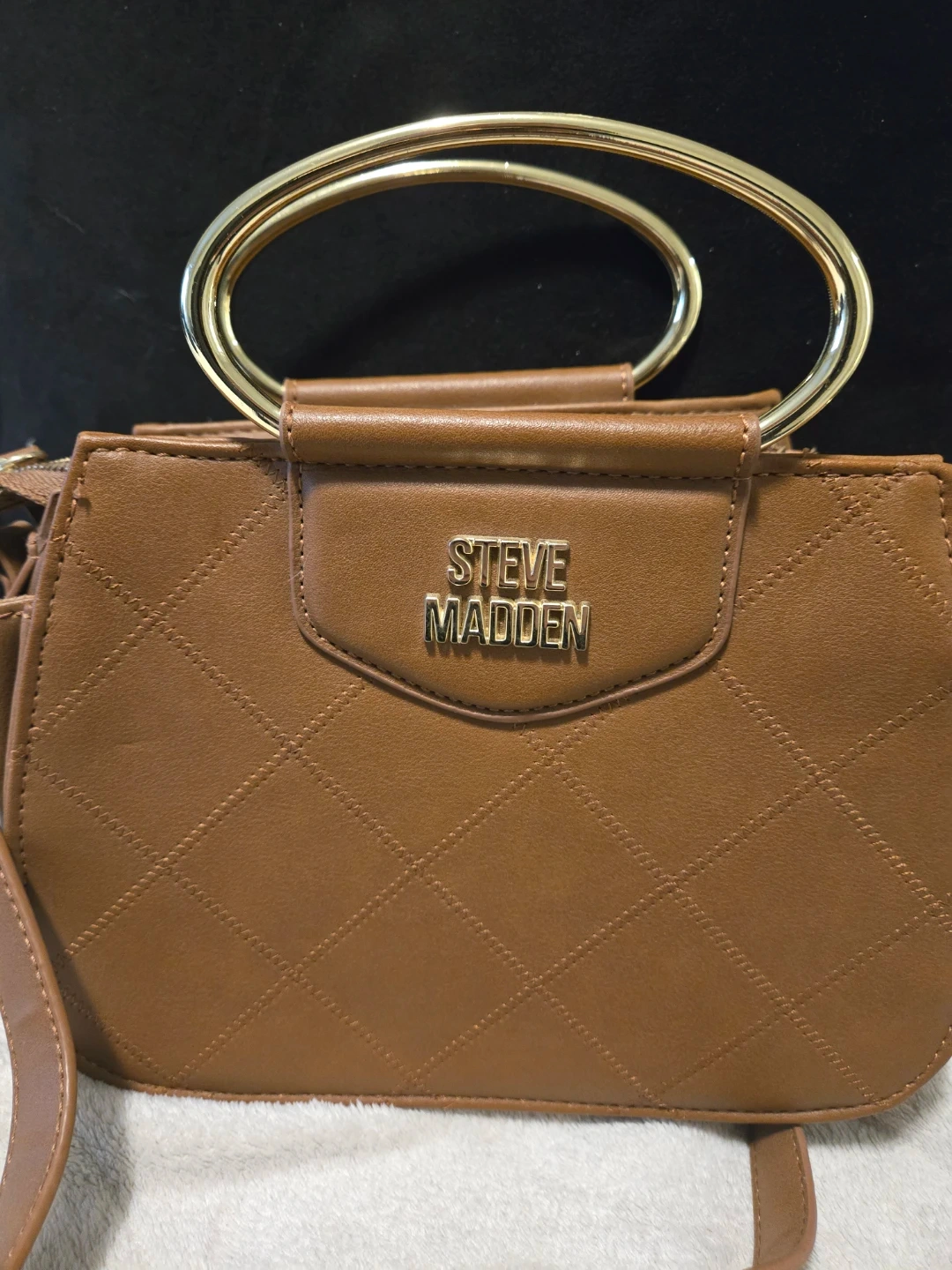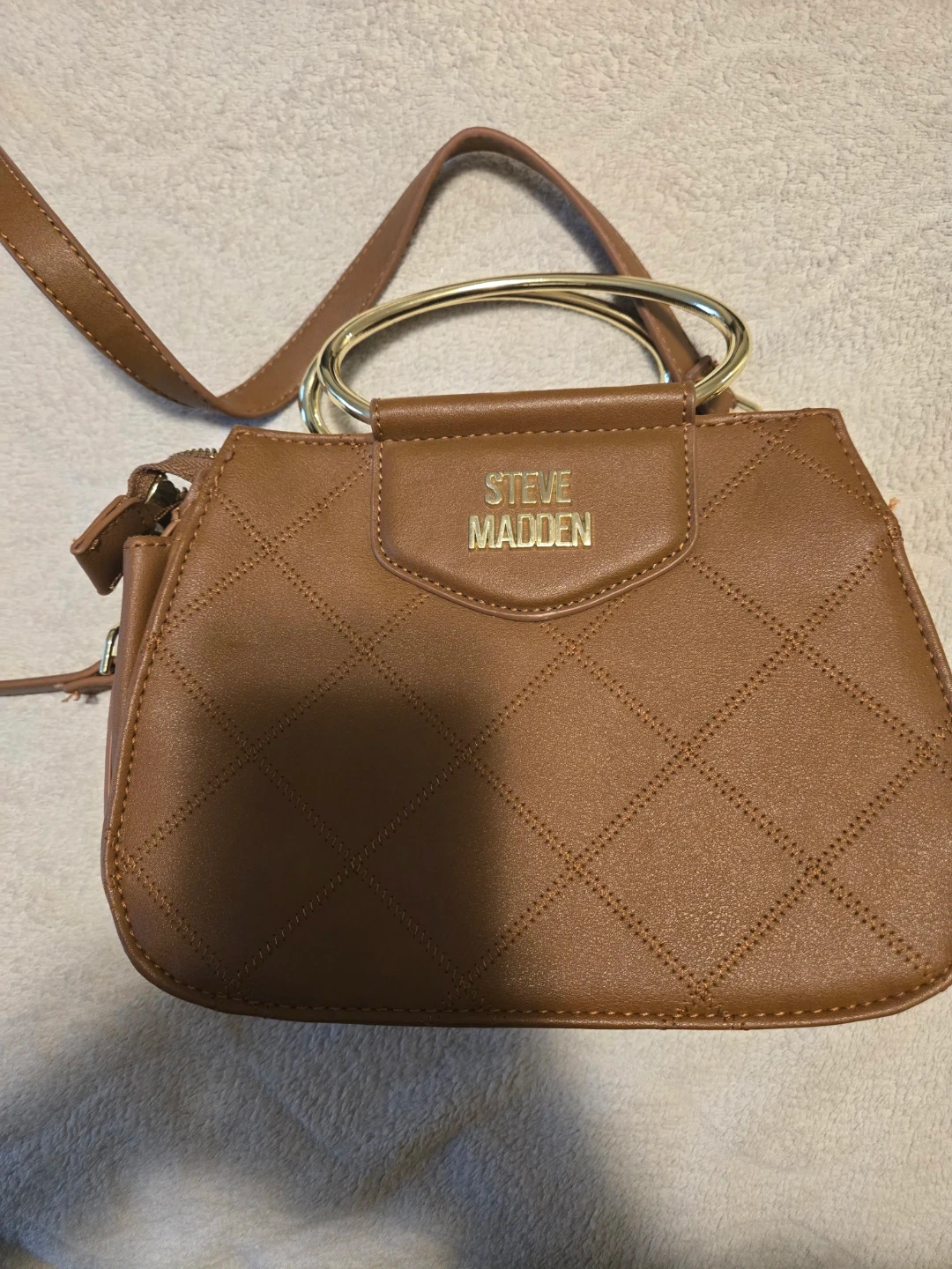This is a brown quilted satchel handbag from Steve Madden. It features a gold-tone metal ring handle and a removable crossbody strap. The interior has multiple compartments for organization. A stylish accessory for everyday use!