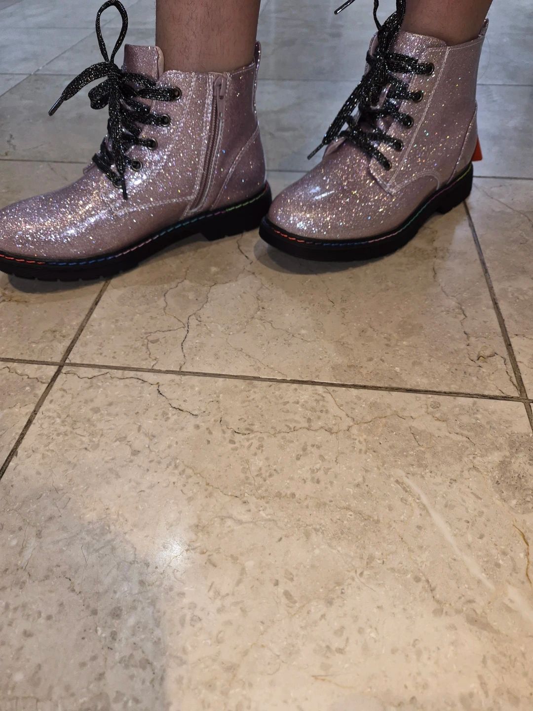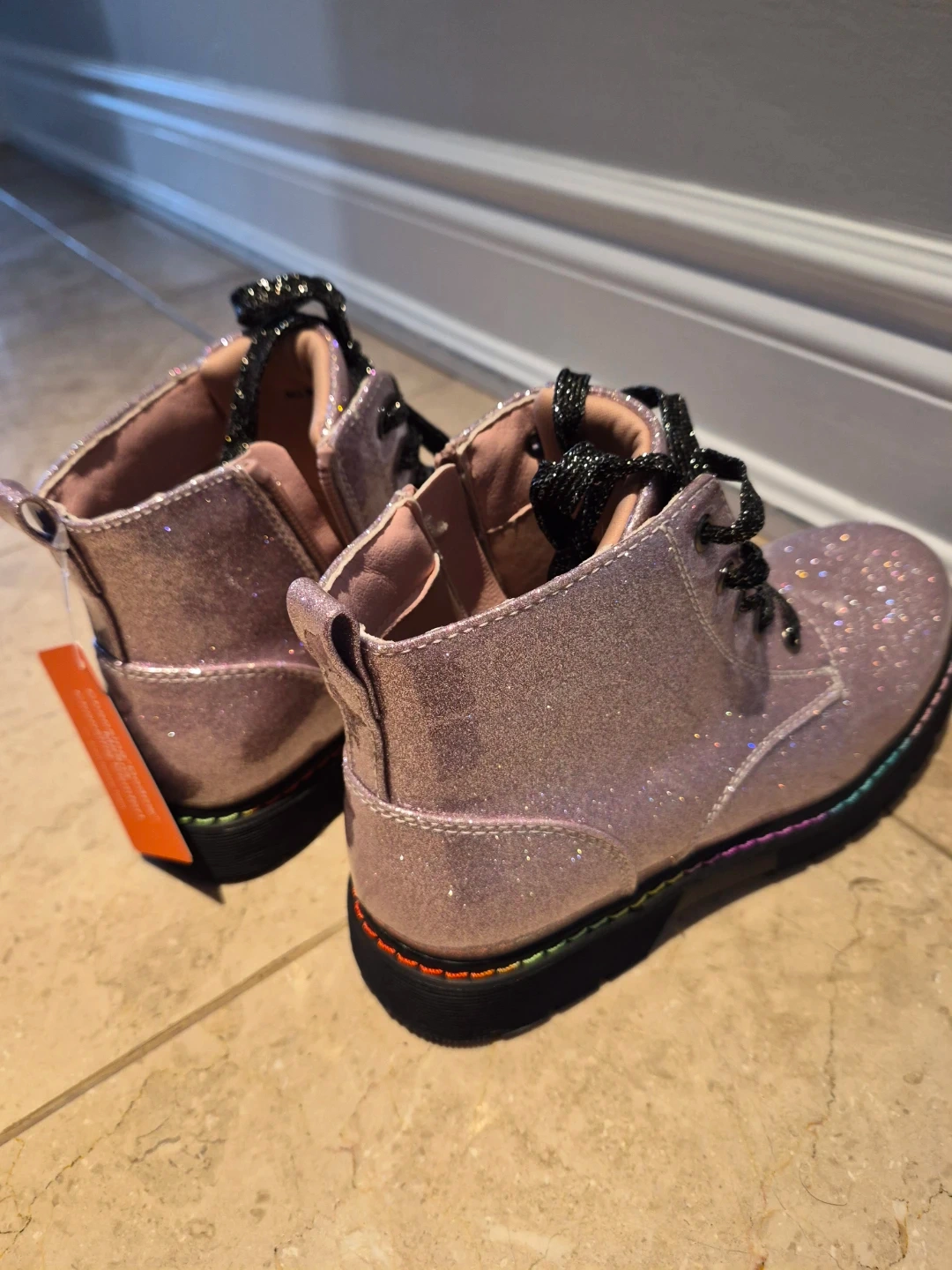 Brand new with tags on! Beautiful sparkly pink combat boots to add some fun to any outfit. They're made from all manmade materials and feature a side zipper for easy on and off. Rainbow stitching adds a pop of colour to the soles. Perfect for making a statement!