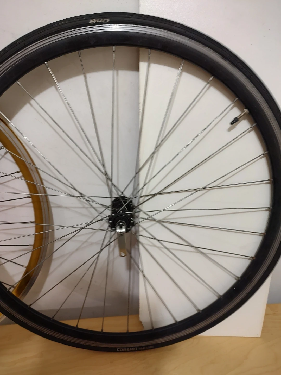 Also for sale is the complete 700C front wheel with tube, tire and black anodized, double wall, aluminum alloy, 30mm deep rear rim with sealed hub and stainless steel spokes, price - $50.