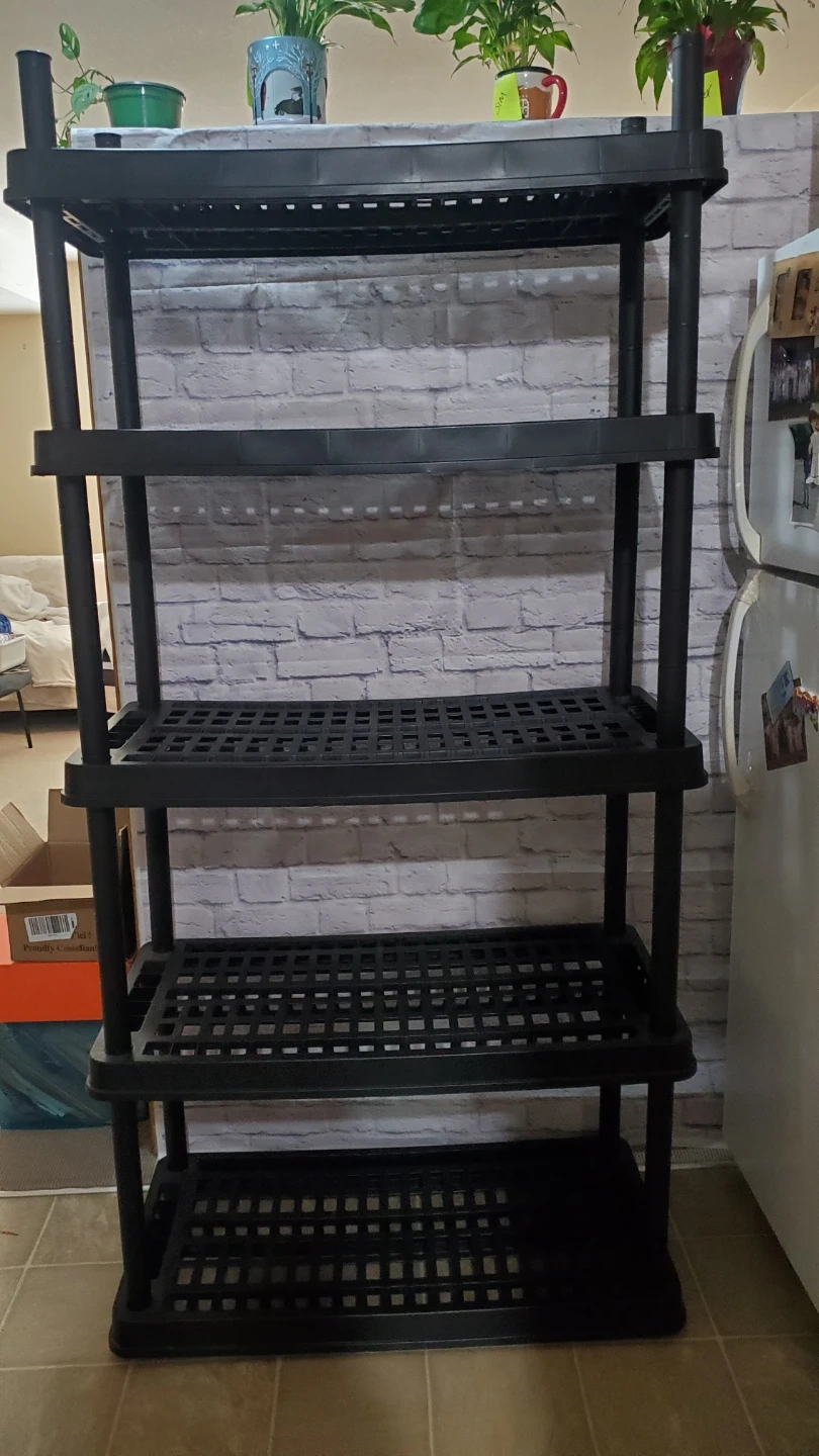 This is a black 5-tier plastic storage shelf unit. It's made of durable plastic and has a grid-style shelving design. Perfect for organizing garages, basements, or workshops!