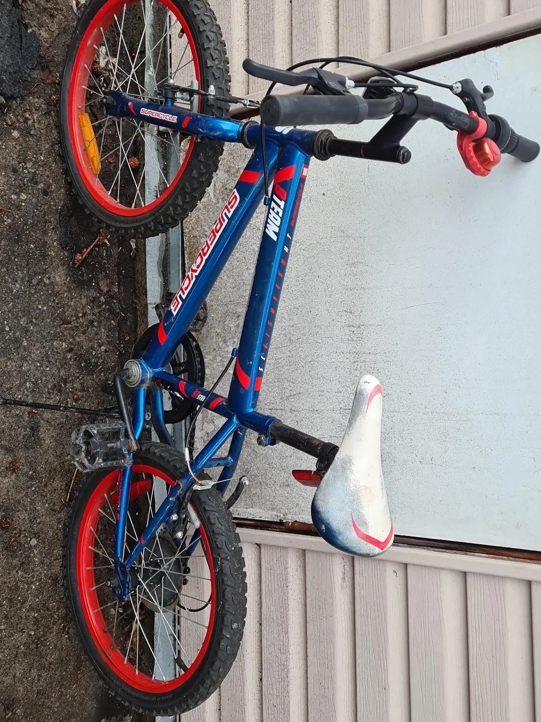 Supercycle "TEAM" bicycle in blue with red accents. Features 18-inch wheels and a white seat with red detailing. Comes with hand brakes and pedals. Great for young riders learning to bike! Both brakes work fine. 5 speed and kick stand.