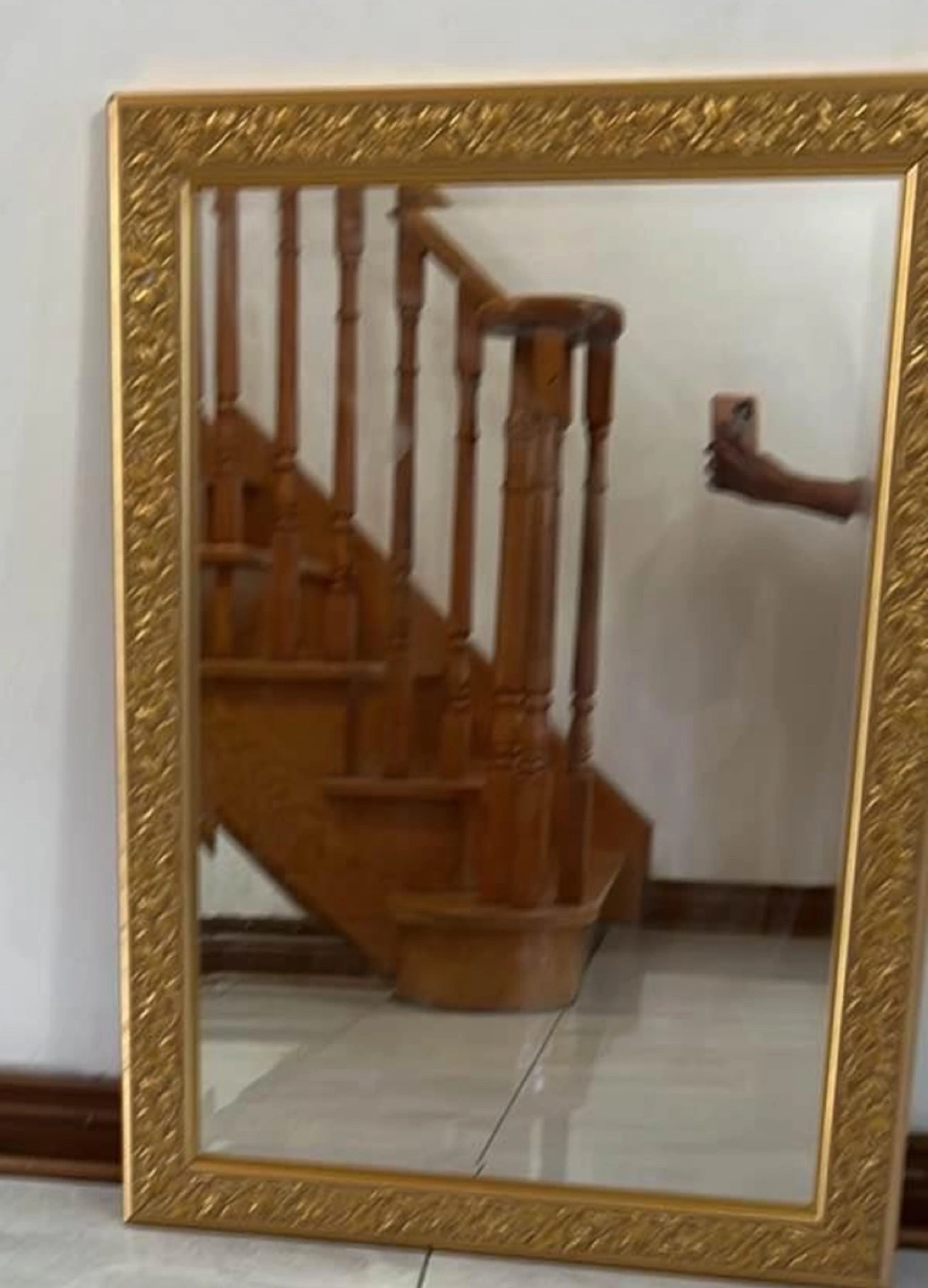 Gold framed mirror with ornate frame. Mirror is approximately 24 x 36 inches. Comes with hanging hardware. Used condition, but in good shape.