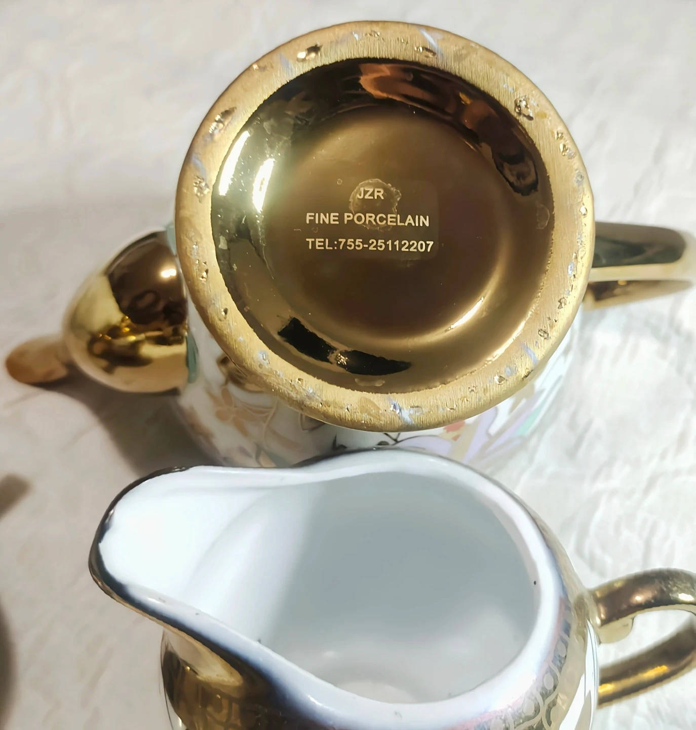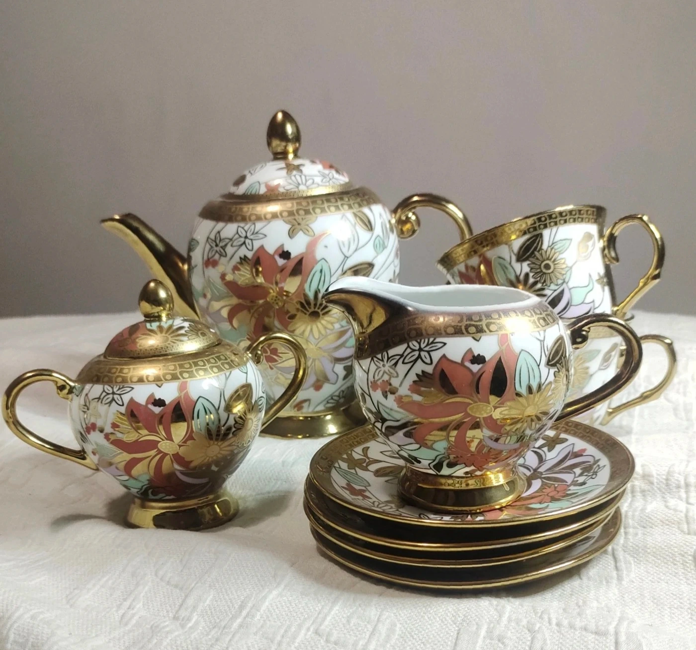 A beautiful JZR fine porcelain teapot set adorned with colourful floral designs and gold trim. This set includes a teapot, a sugar bowl, a creamer, and four saucers. It's perfect for serving tea or coffee to guests.