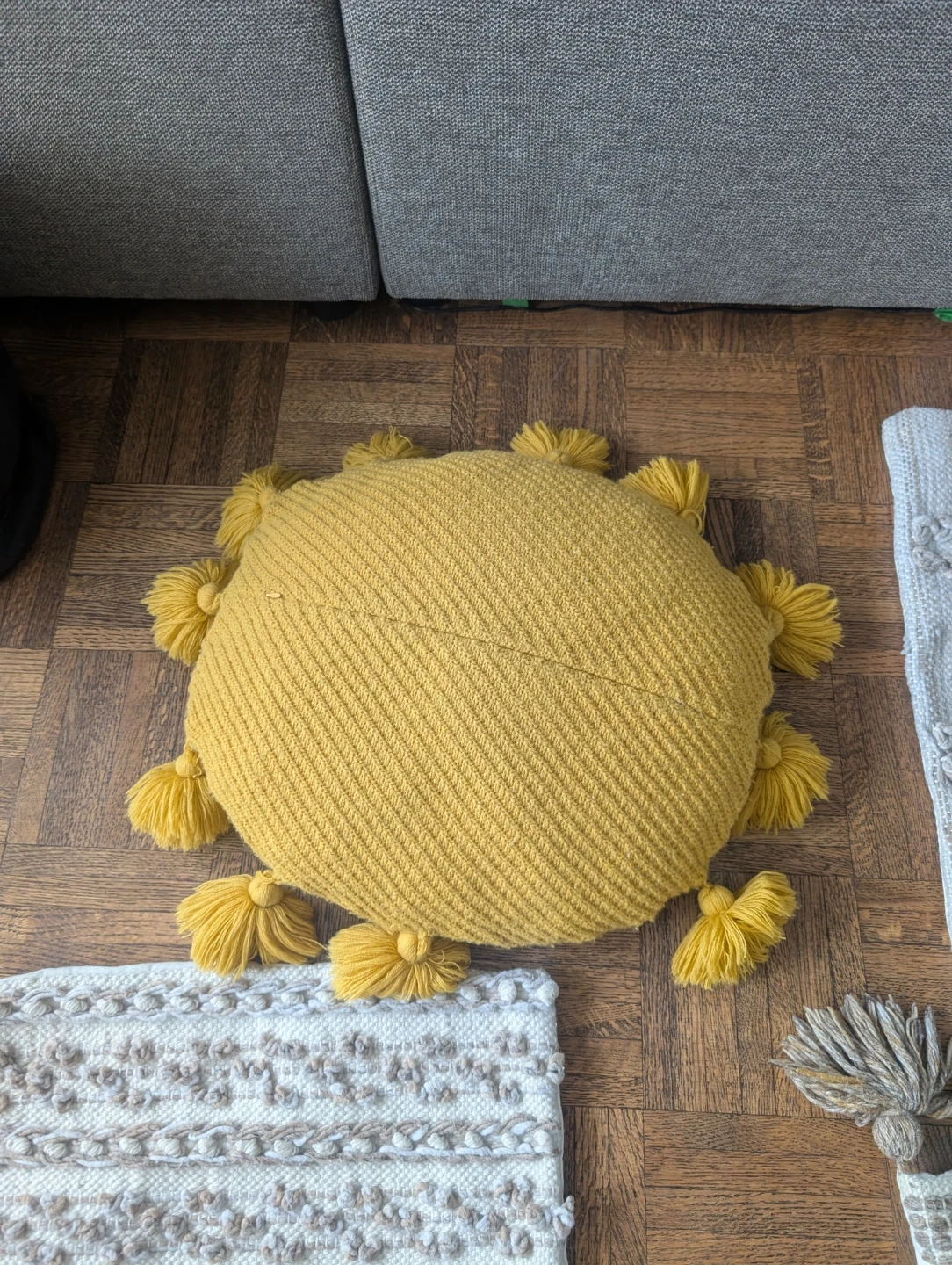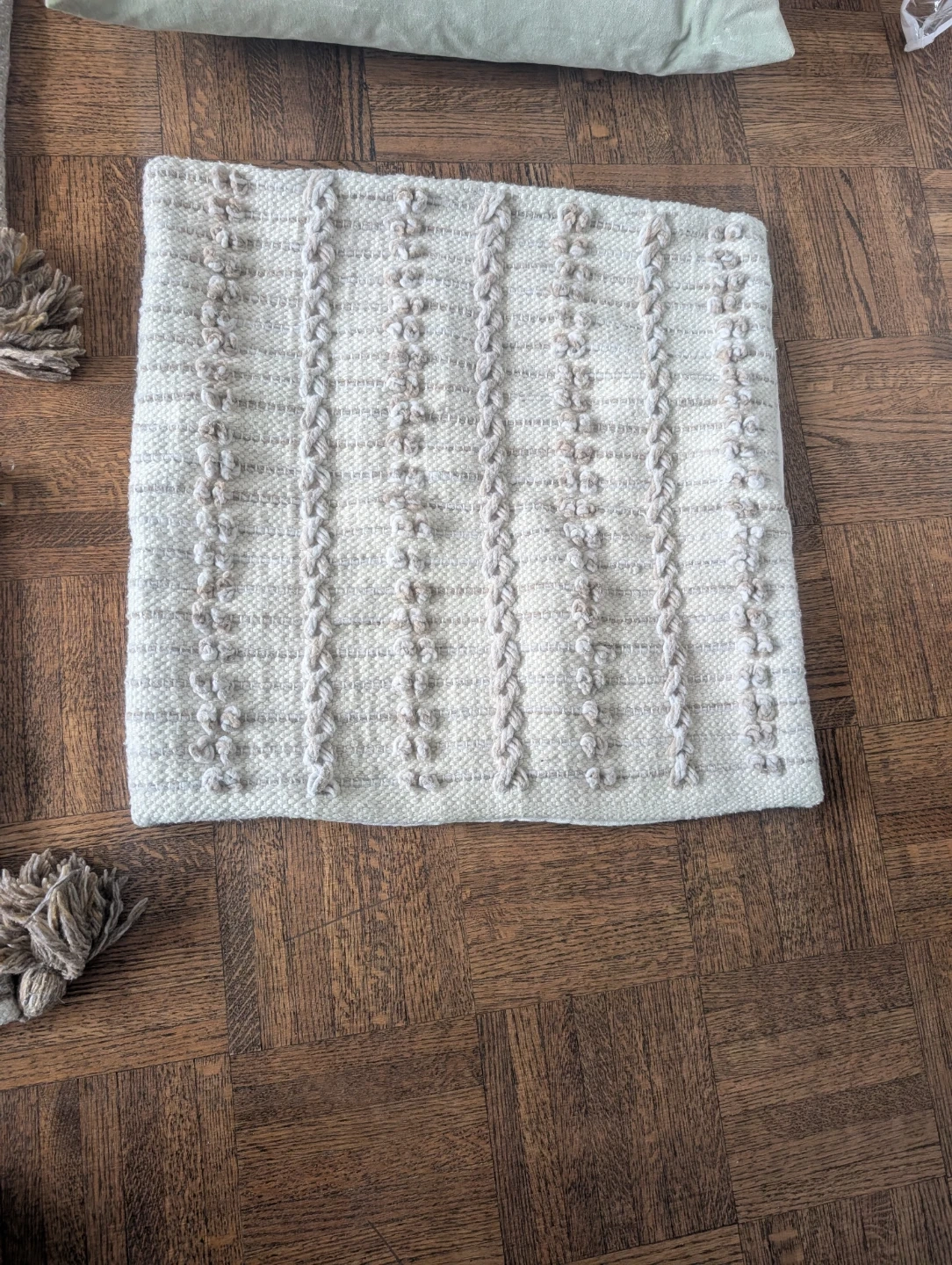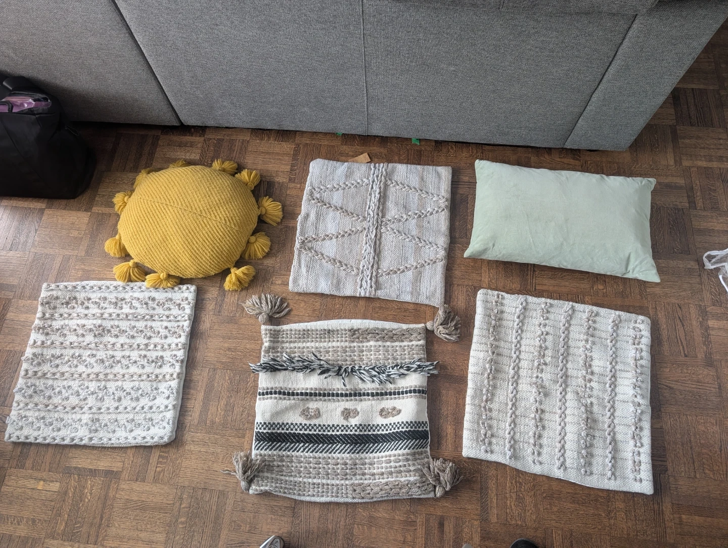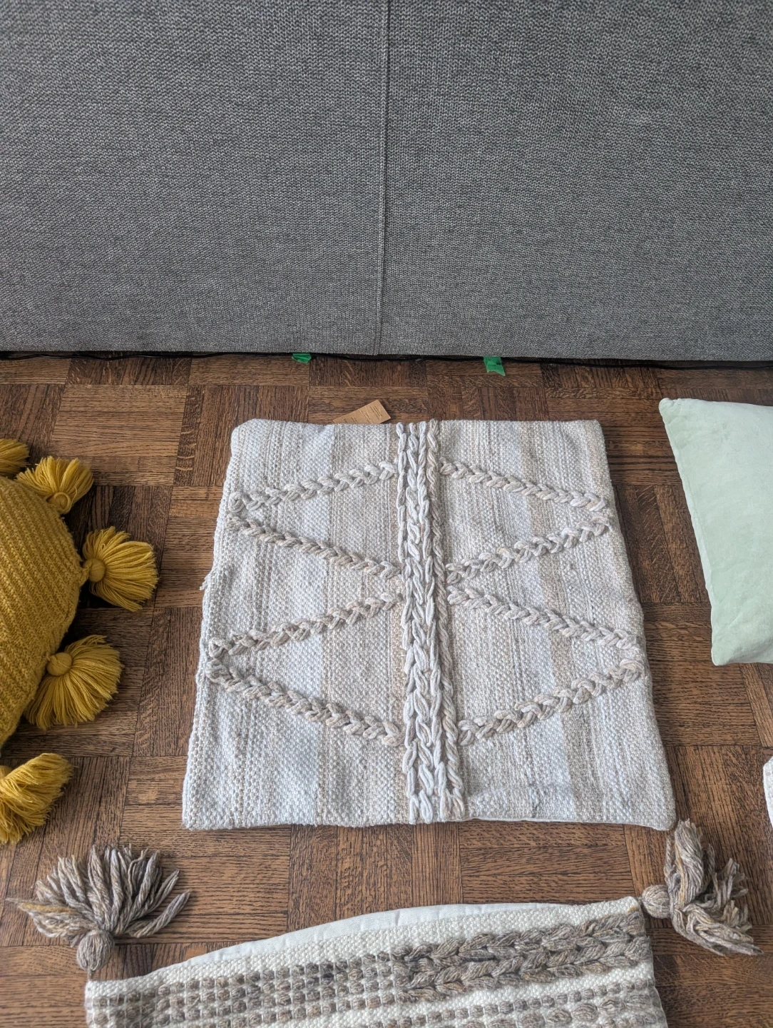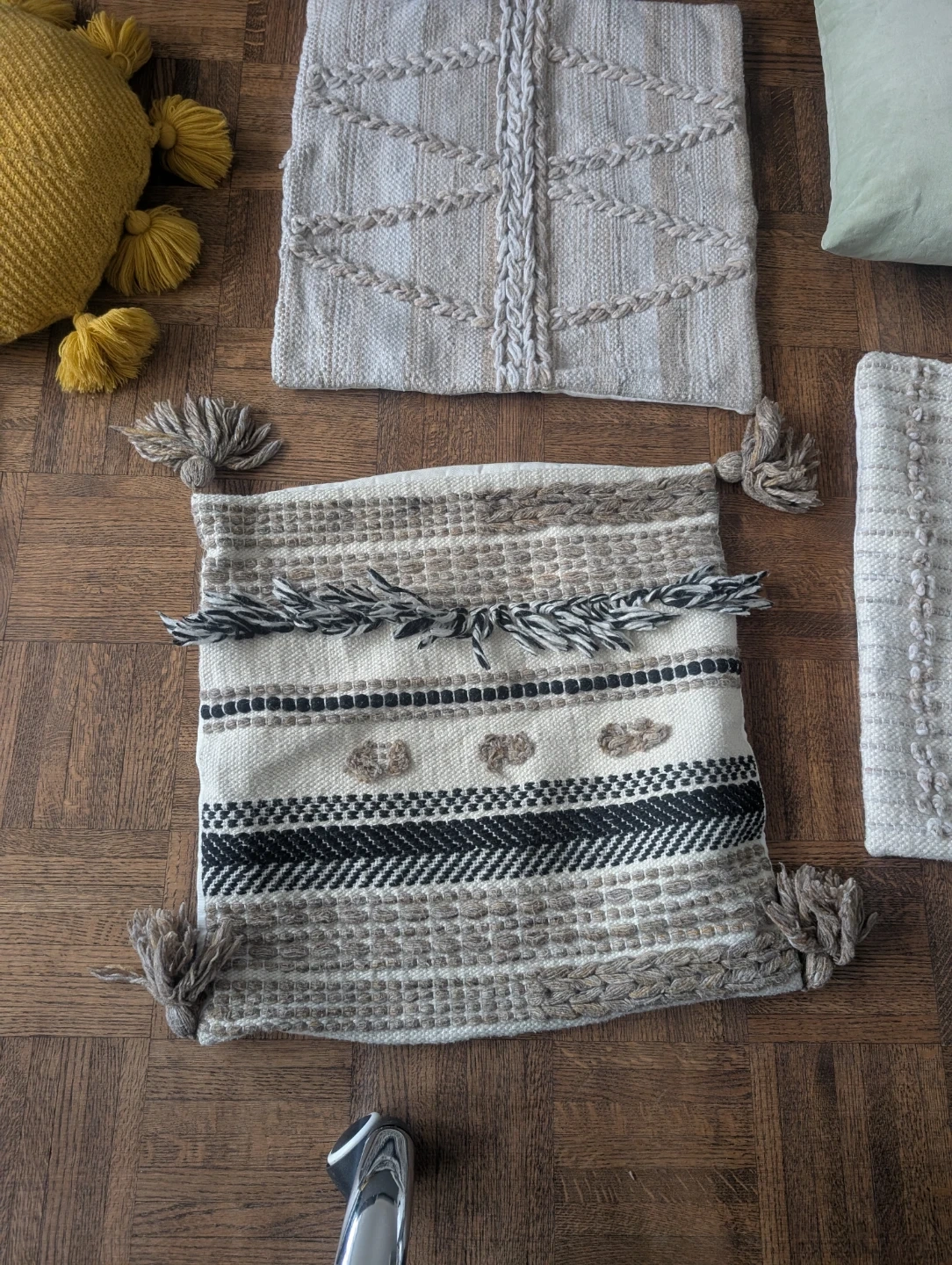 Set of four decorative cushion covers with a boho, textured design. They're made from a woven fabric and include tassels on some of the covers. Covers measure approximately 17x17 inches / 50x50 cm. Include a green cushion pillow and a yellow cushion.