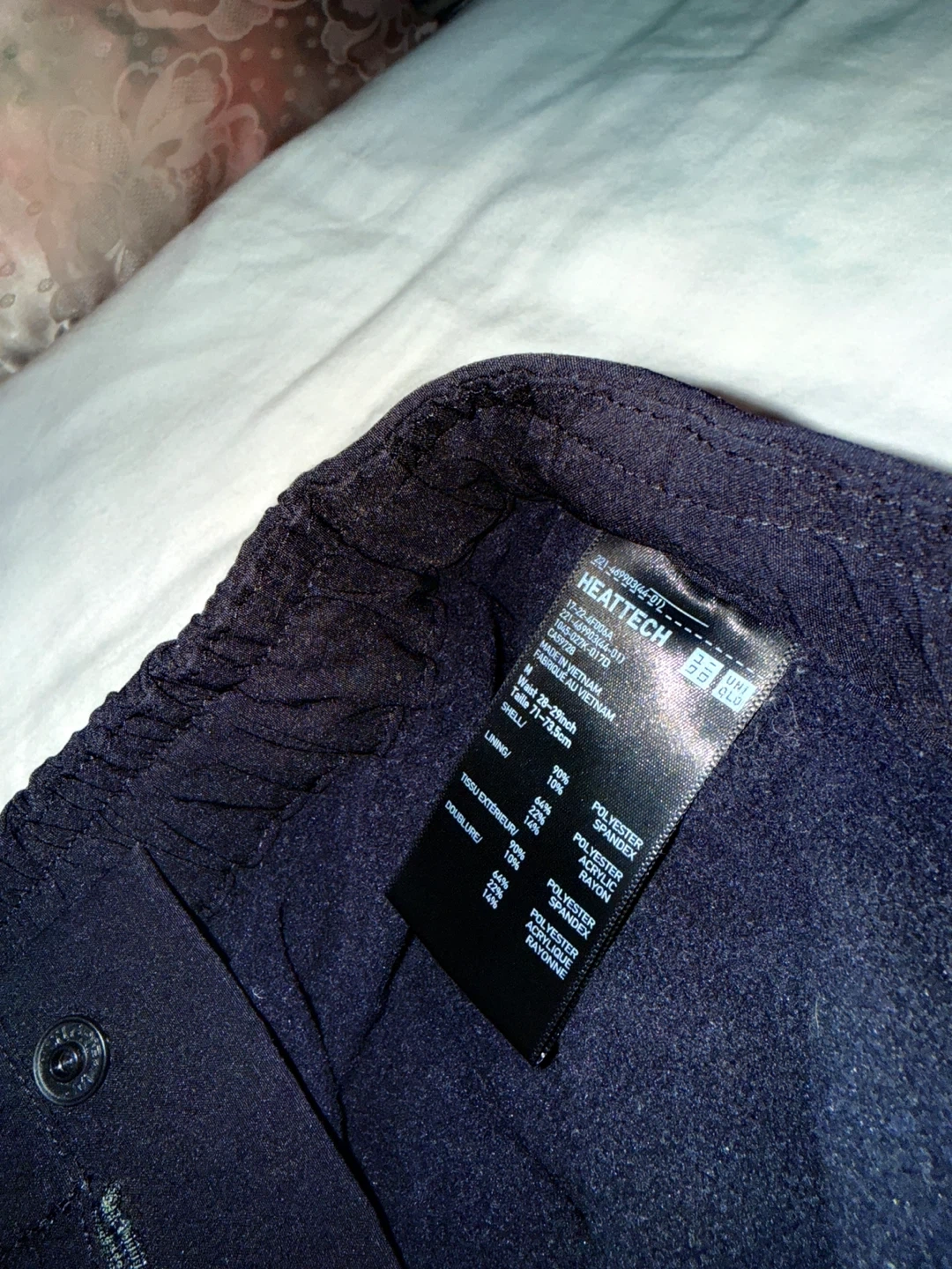 Uniqlo Heattech pants in black. The shell is 70% polyester, 10% acrylic, 10% rayon, and 10% spandex. These pants are great for keeping warm during colder weather!