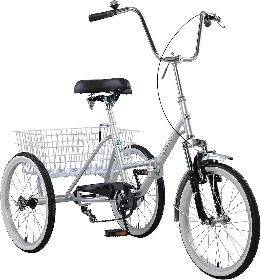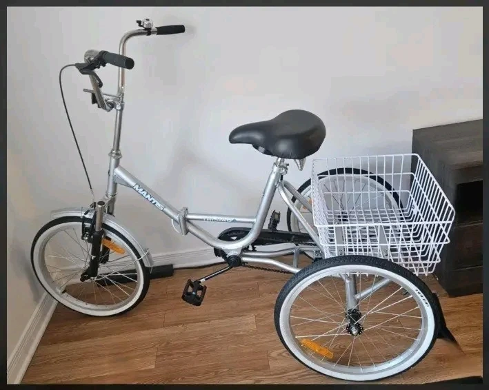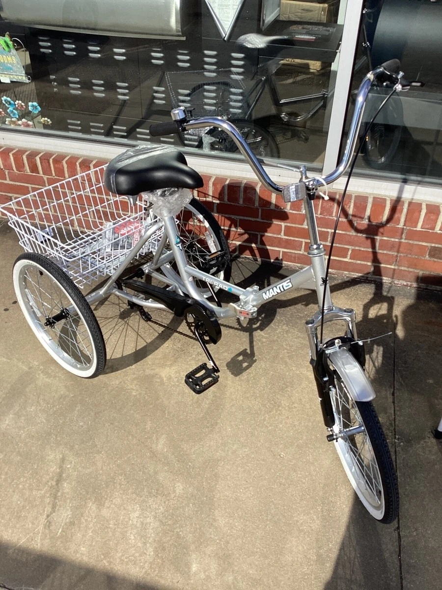 This Mantis folding tricycle is a convenient way to get around. It's got a large front basket for carrying groceries or other items. Easy to fold for storage and transport!