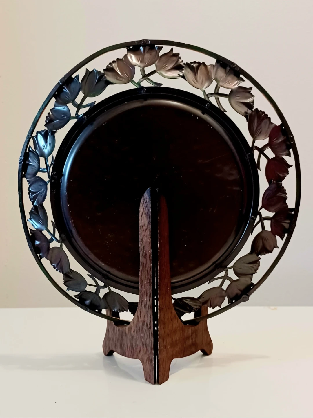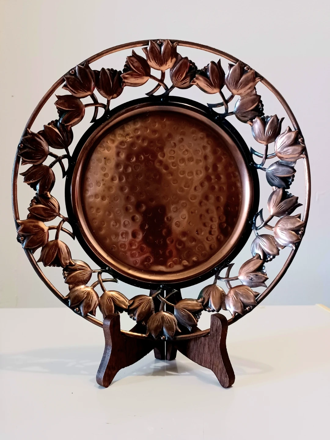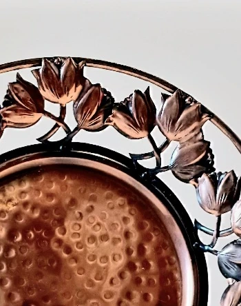 Vintage , Centerpiece, Art Nouveau French Ateliers , Hand-hammered Copper Decorative Table/ Wall Plate . It features Intricate openwork borders with Tulips