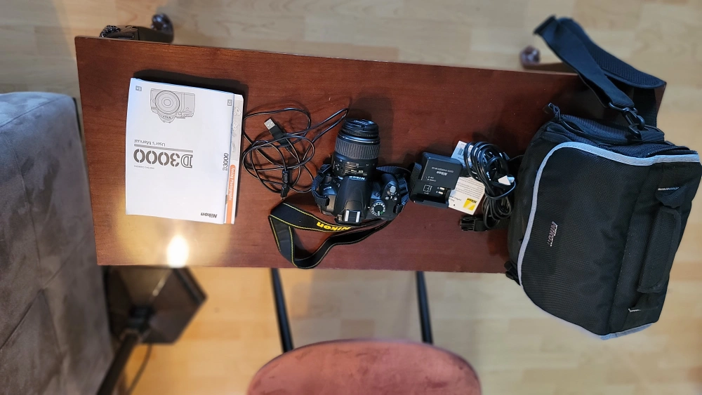 Very low on shutter count. Selling a Nikon D3000 digital camera. It comes with a lens, battery charger, USB cable, user's manual, and a carrying bag. Ready for your photography adventures!