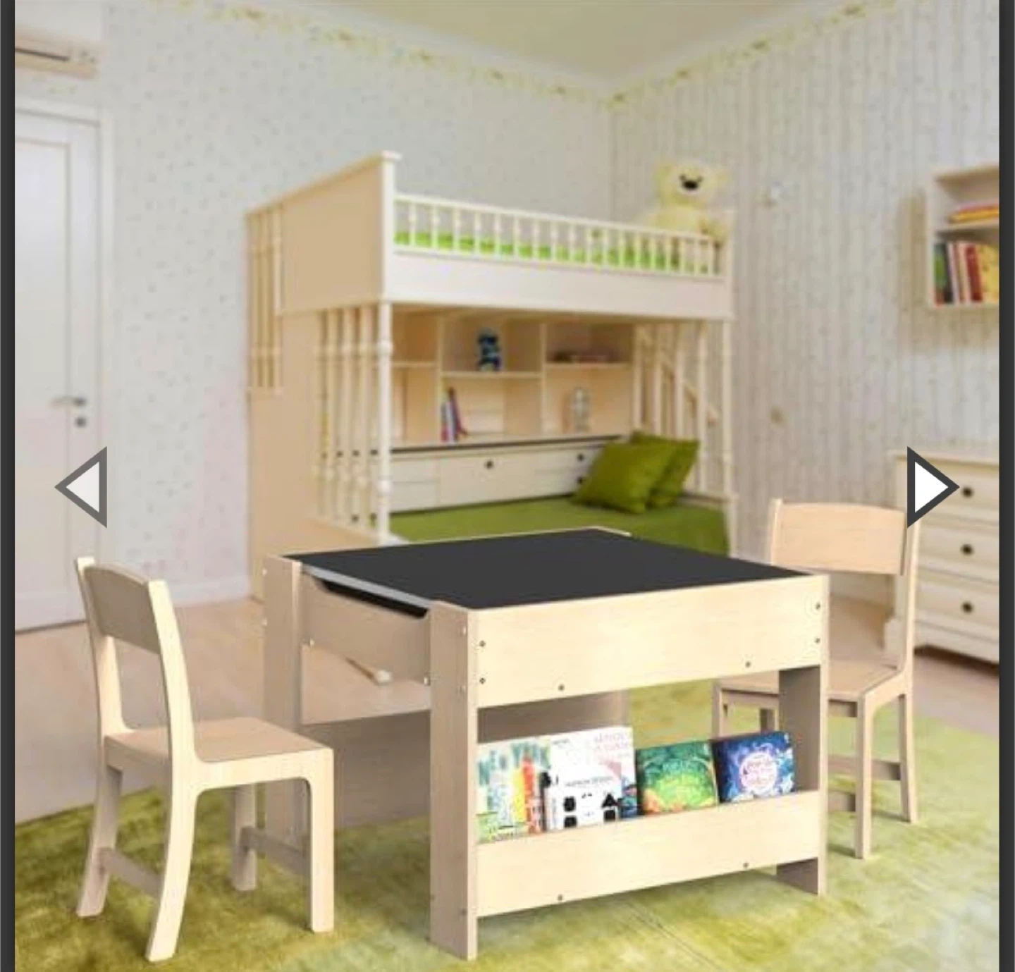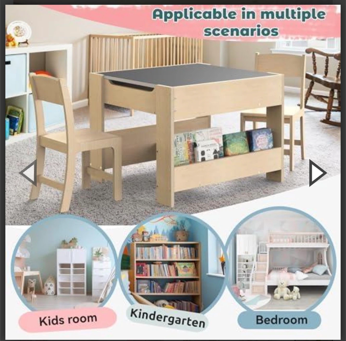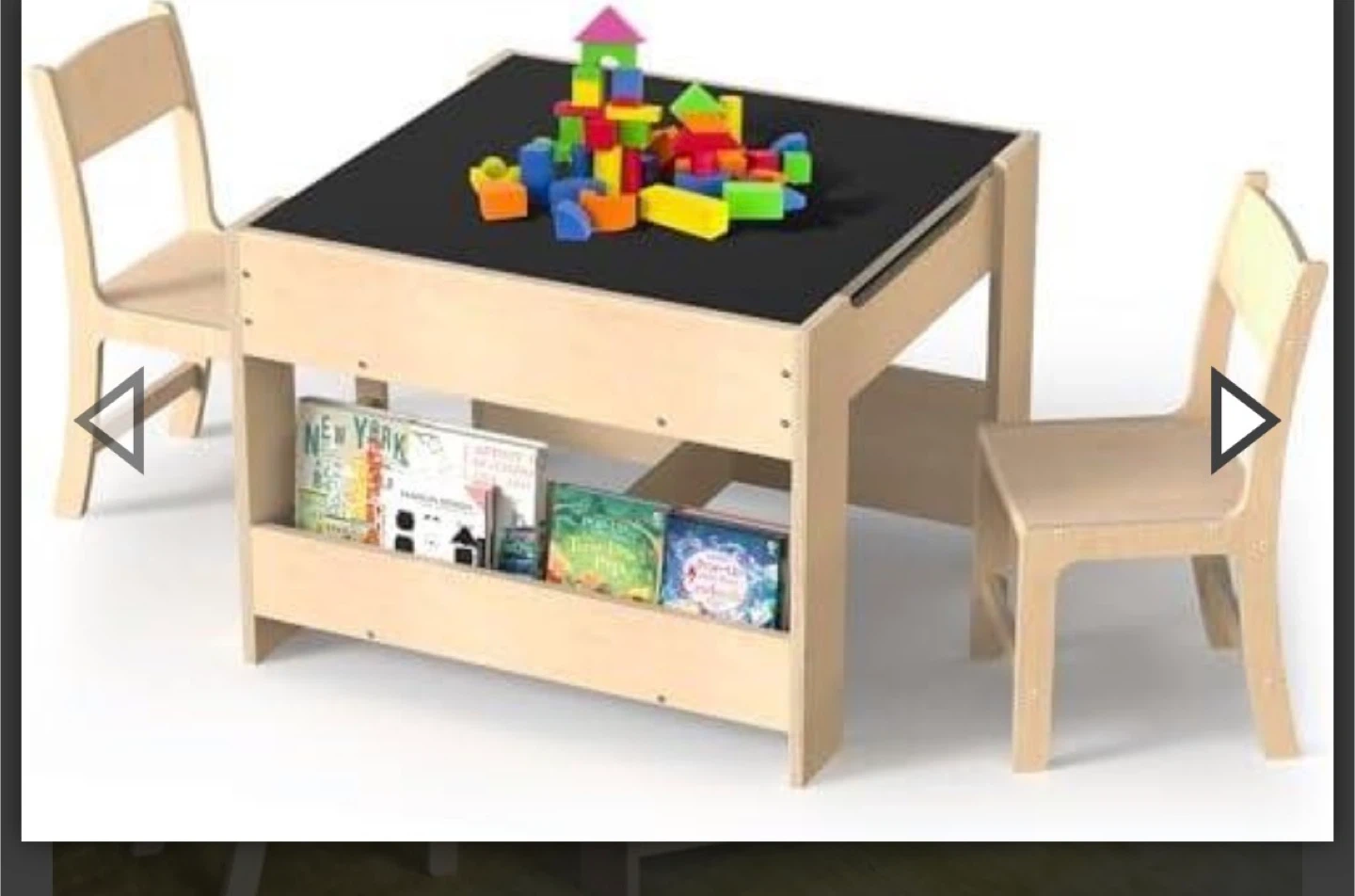 This versatile children's activity table features four different surfaces: a chalkboard, a drawing surface, a building block area, and a reading/writing space. It includes convenient book storage shelves underneath. Rounded corners for safety.