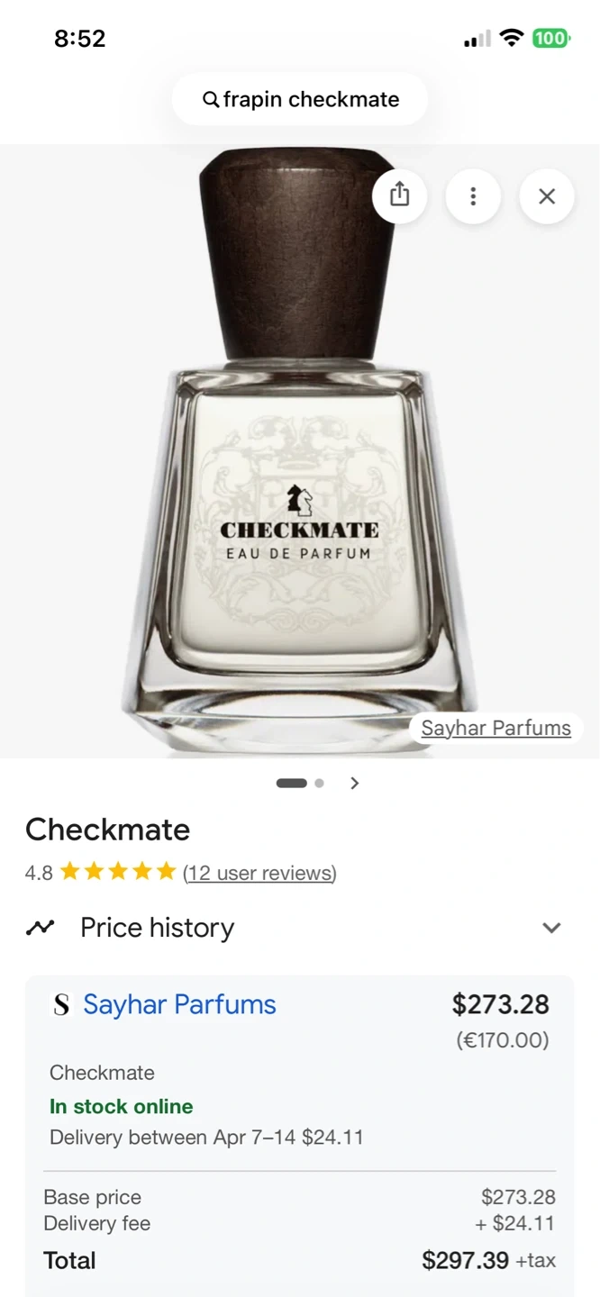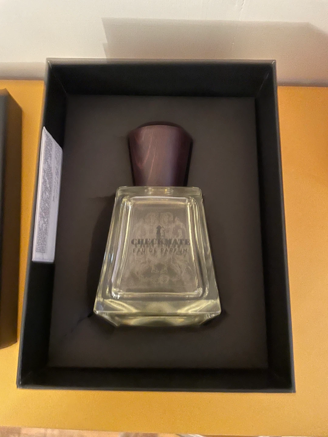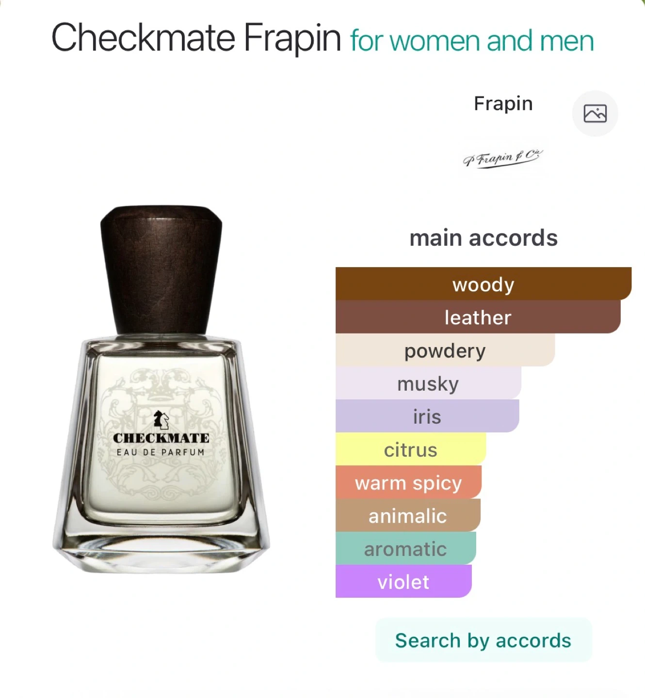 This is Frapin Checkmate Eau de Parfum, a unisex fragrance. It's presented in a 100ml bottle and comes with its original packaging. The scent is smooth with notes of Iris, Suede and Cashmere.