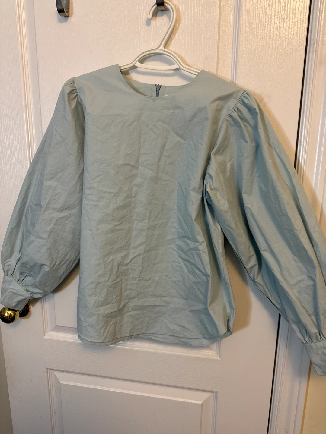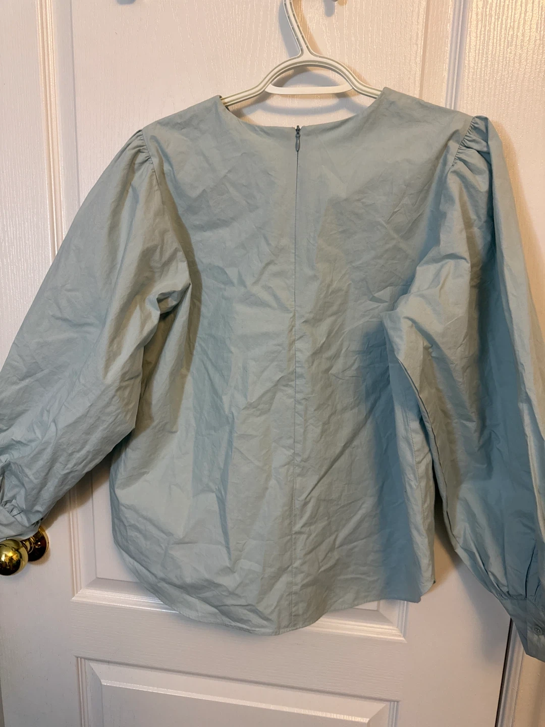 Oak + Fort blouse is made from cotton. Features a light blue colour with puff sleeves.