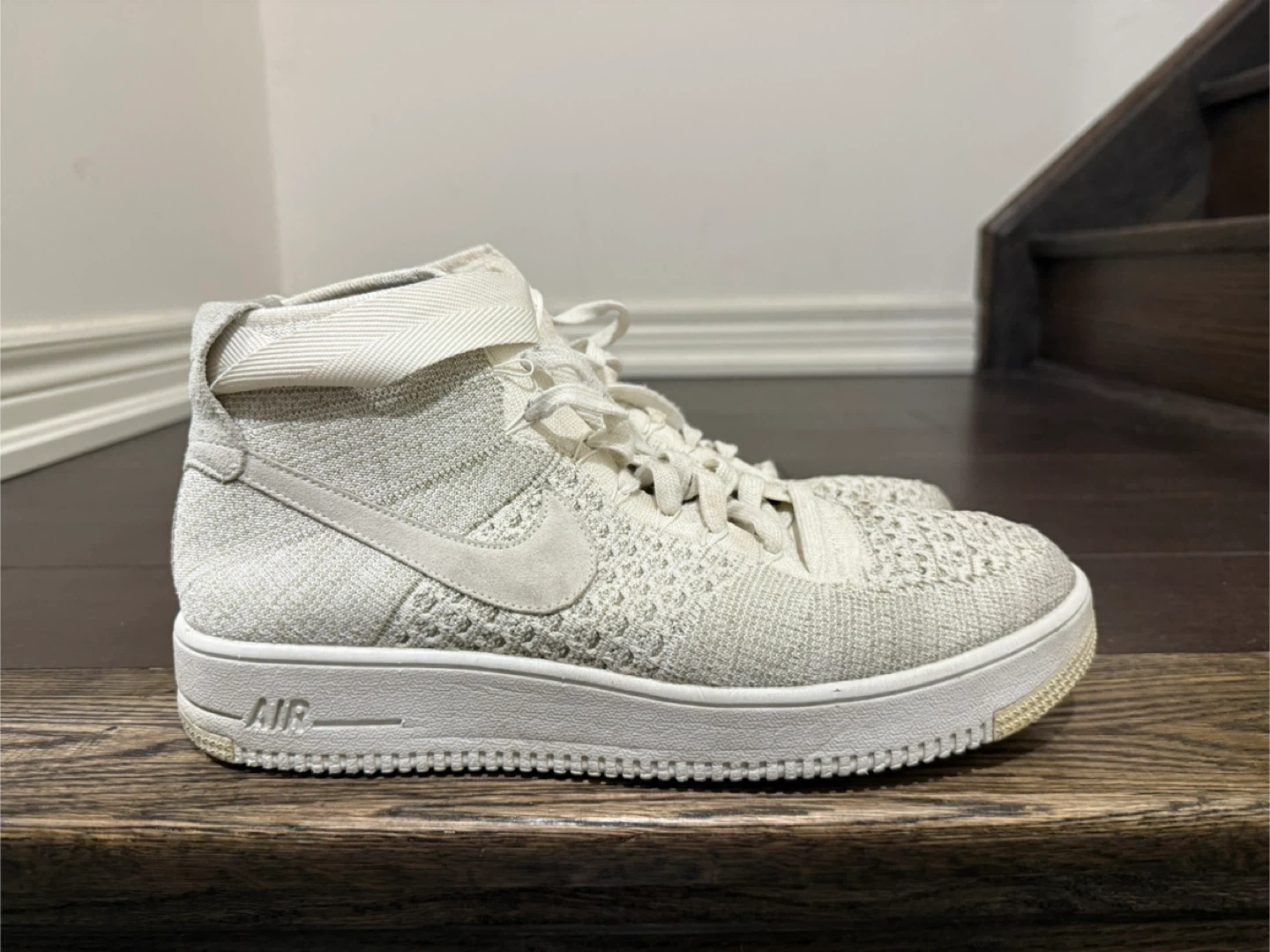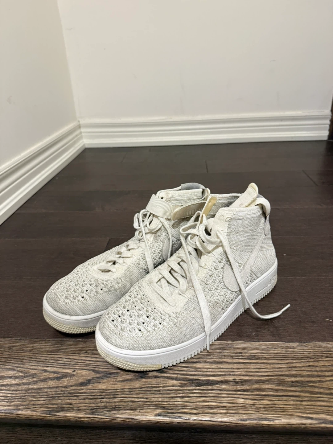 These Nike Air Force 1 Flyknit Mid Top sneakers are a stylish cream colour. They're a men's US size 10.5, EU 44.5, UK 9.5, and CM 28.5. Great for casual wear or sports!
