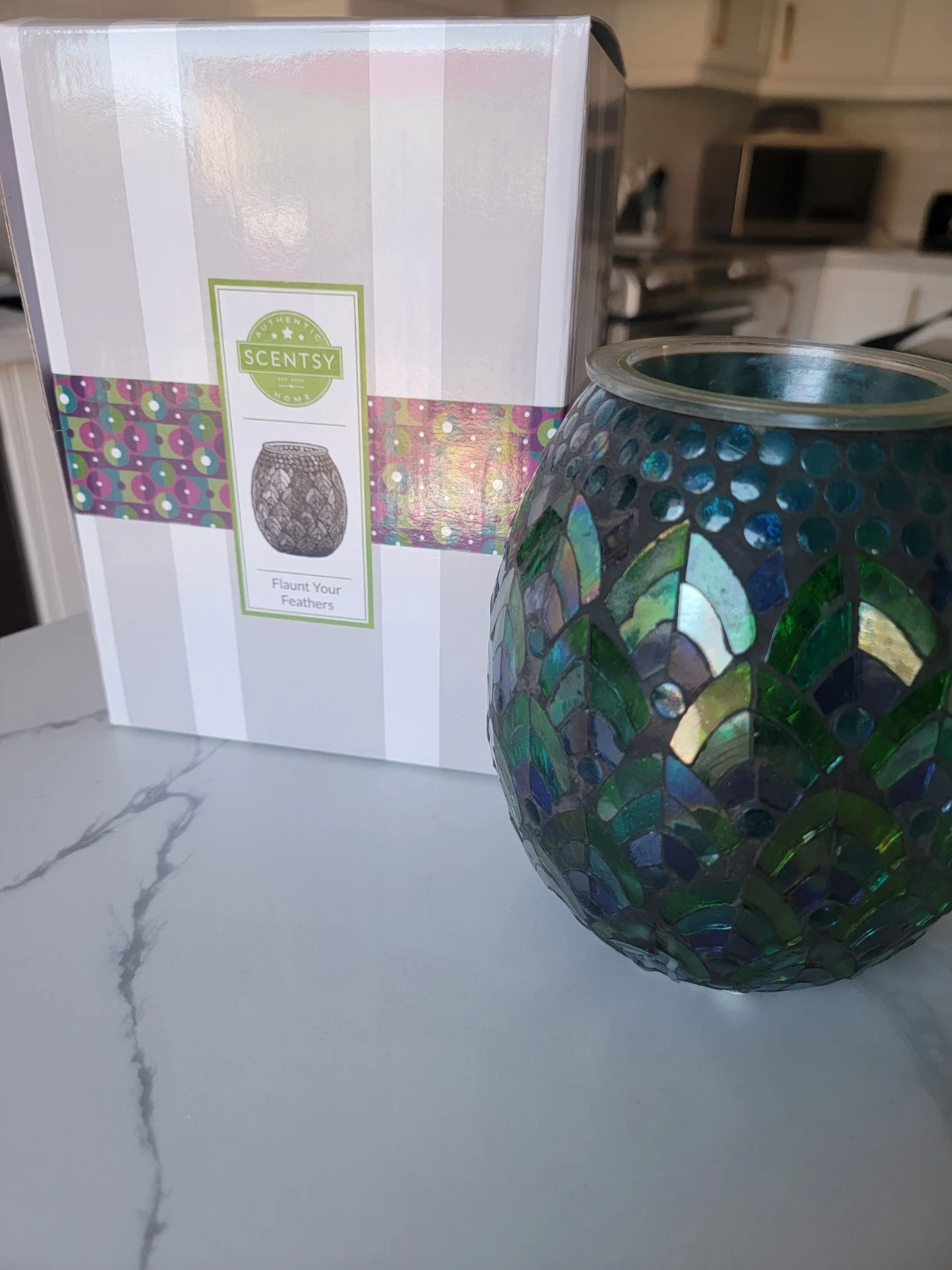 This Scentsy wax warmer, named "Flaunt Your Feathers", features a beautiful mosaic design in shades of teal and green. It comes with its original box. This warmer is perfect for adding a decorative touch and pleasant fragrance to any room in your home.