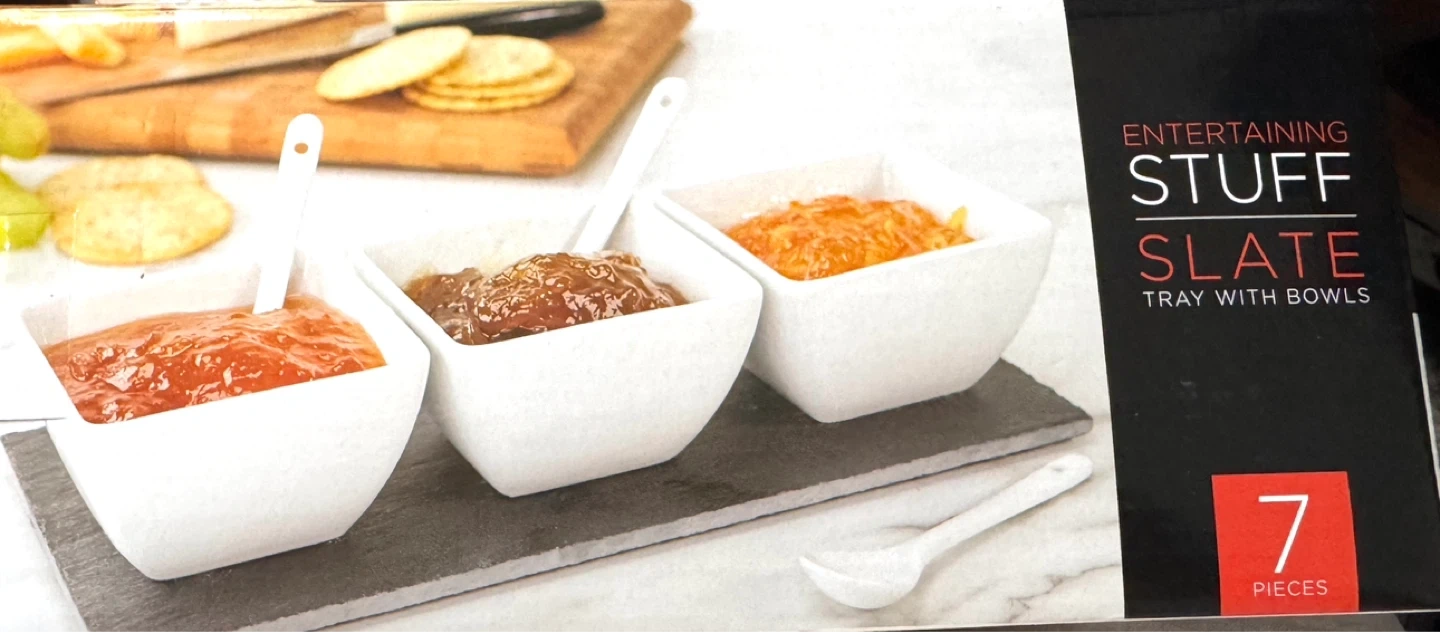 EntertainingStuff Slate Tray with 3 White Porcelain Bowls