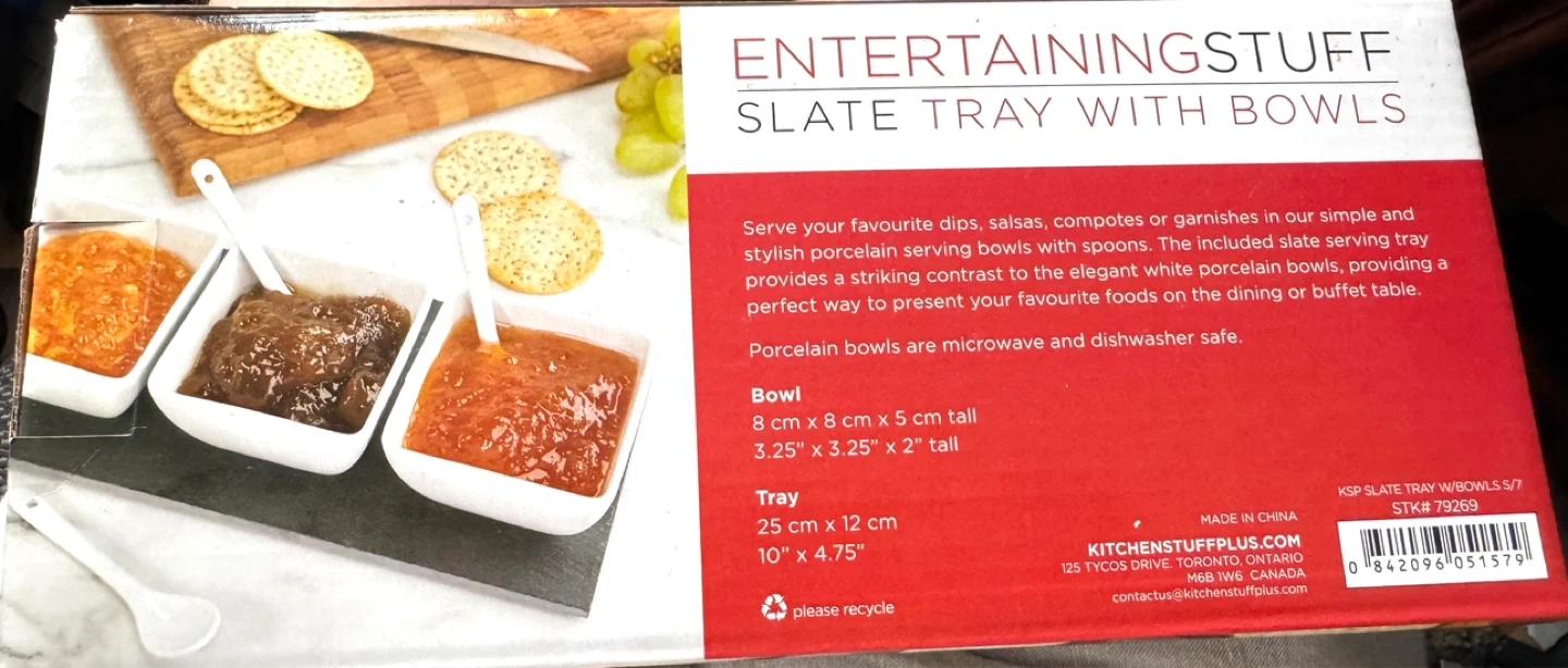 This set includes a slate tray with three stylish white porcelain serving bowls and spoons. The bowls are microwave and dishwasher safe. Tray is 25 cm x 12 cm and bowls are 8 cm x 8 cm x 5 cm.