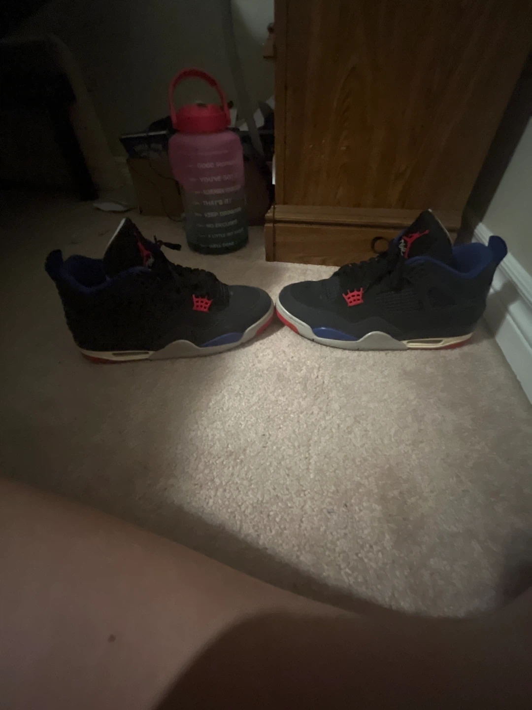 Selling a pair of Nike Air Jordan 4 Retro sneakers. They are black with blue and red accents, and in good condition. Size 12 men’s