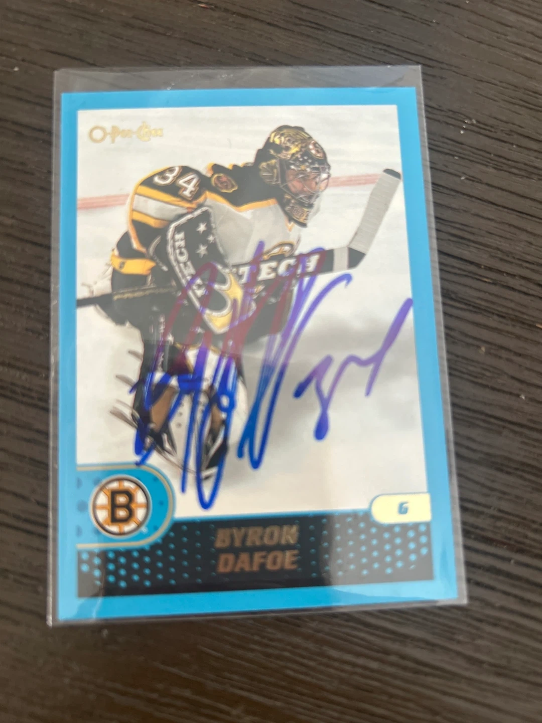 This is a 1989-90 O-Pee-Chee Byron Dafoe hockey card for the Boston Bruins. It's autographed by the player.