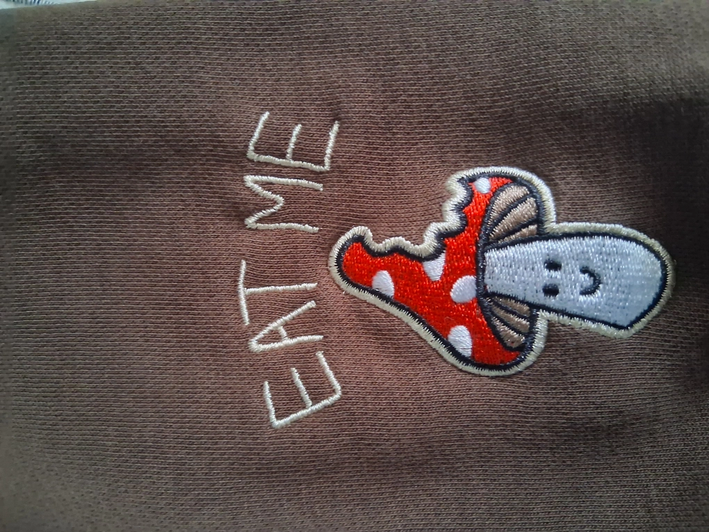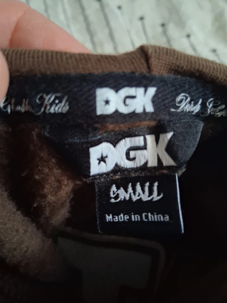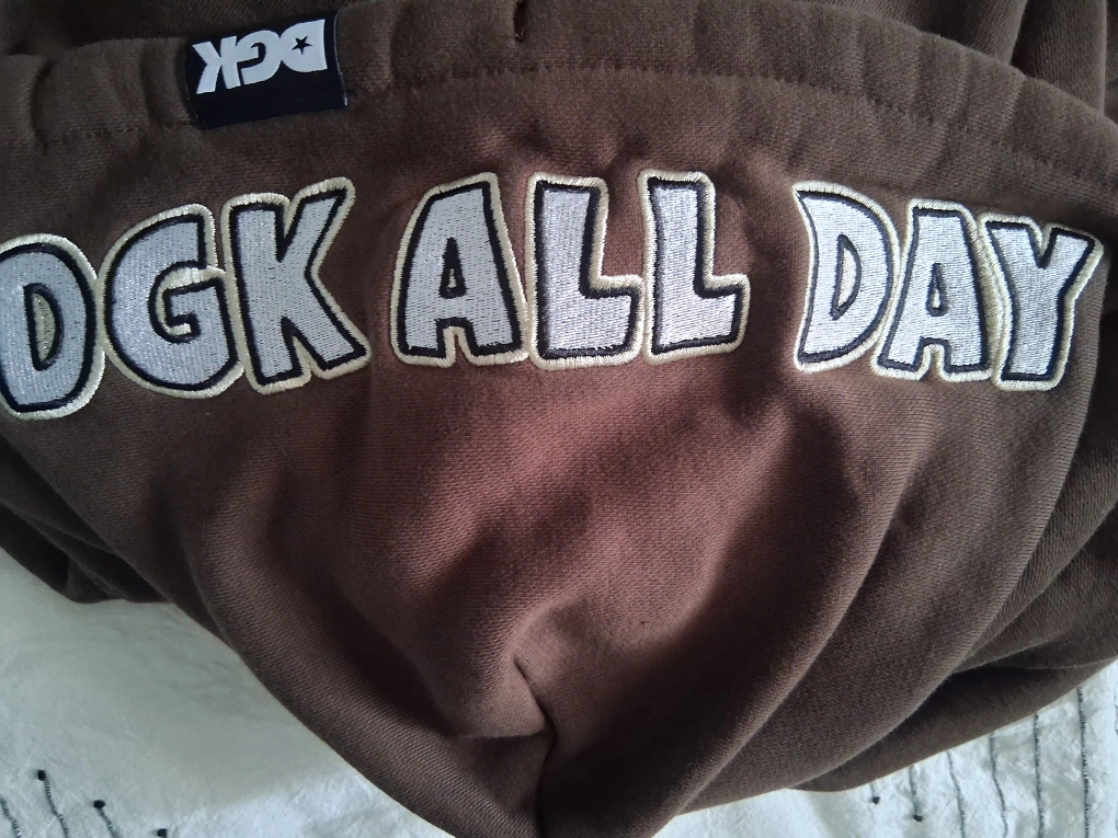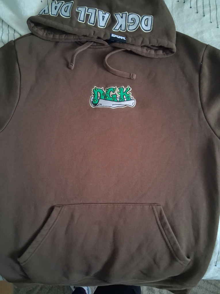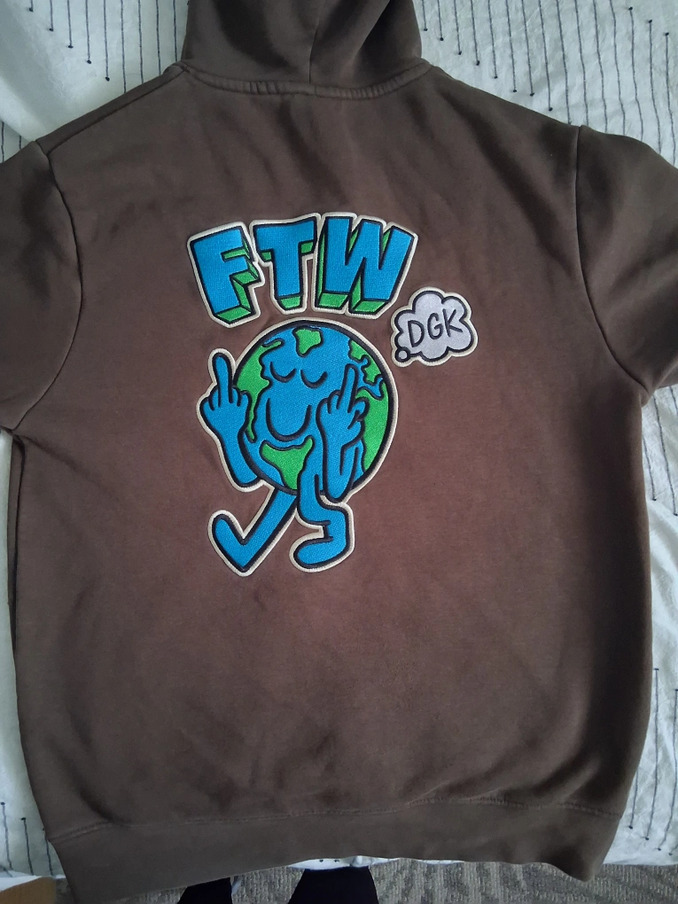 Selling a DGK hoodie in brown. It's a size small and features some cool designs like 'DGK All Day' on the hood and a mushroom graphic that says 'Eat Me'. The back has a unique graphic with 'FTW'. A stylish and comfy hoodie! bought in 2024 and it was only worn twice.