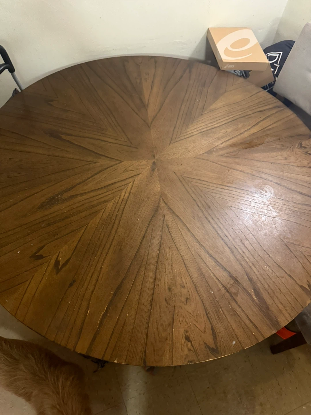 This is a round dining table with a wood veneer top. It has a starburst wood grain pattern. The table has a natural wood finish and shows some signs of wear. It's perfect for a dining room or kitchen.