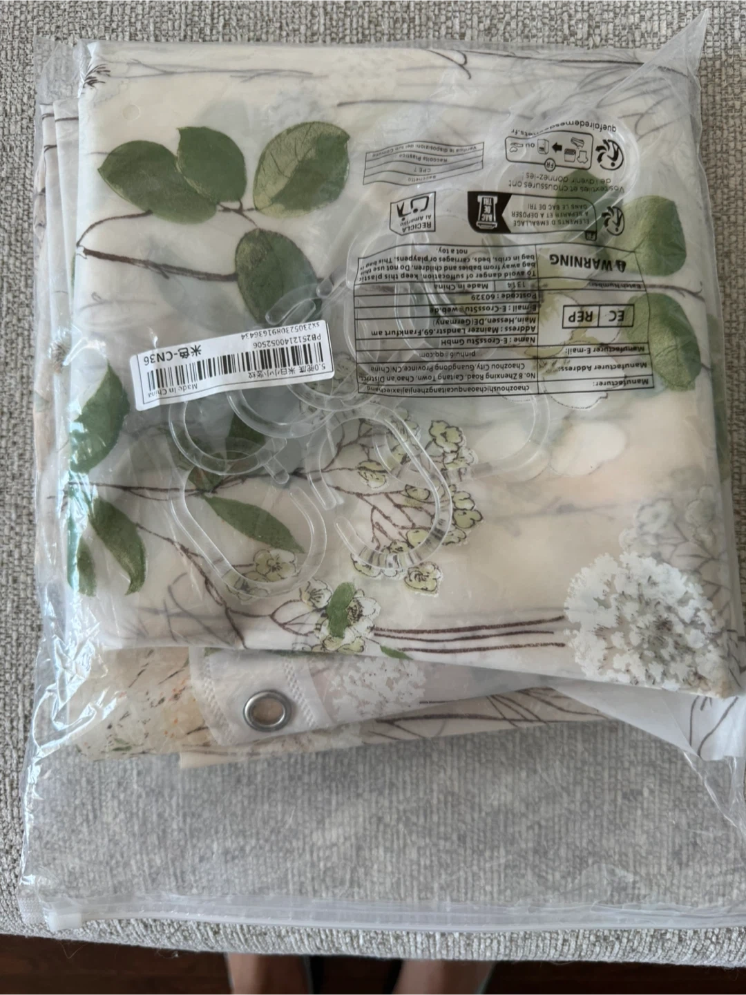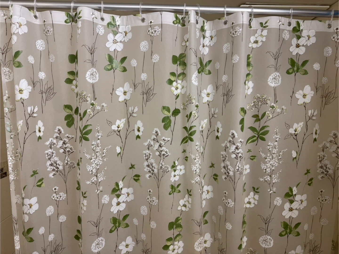A fabric shower curtain with a delicate floral and leaf pattern in white, green, and beige. It comes with matching plastic hooks. Standard size.