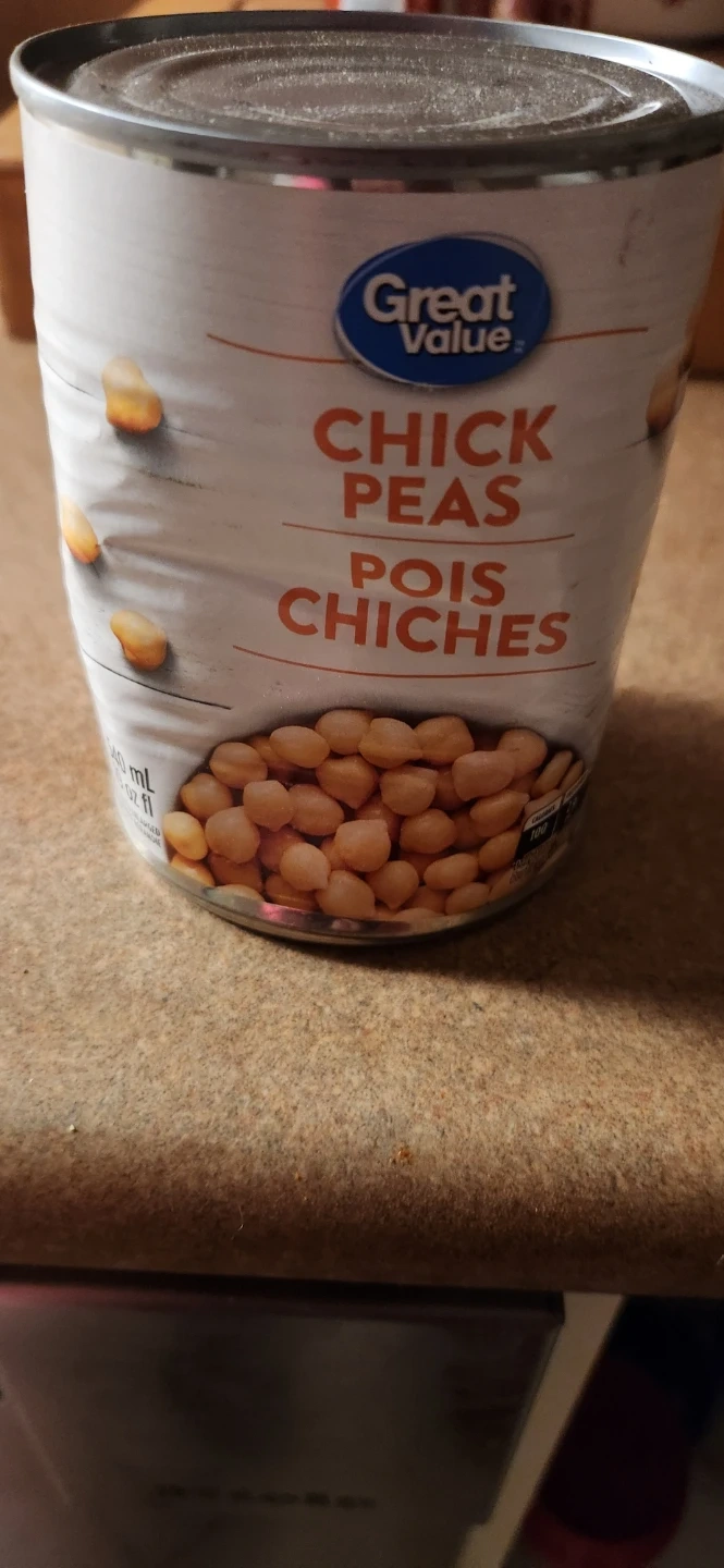 Great Value brand chick peas (pois chiches) in a 540 mL can. They're a versatile pantry staple for salads, soups, or dips. A can offers 100 calories per serving.