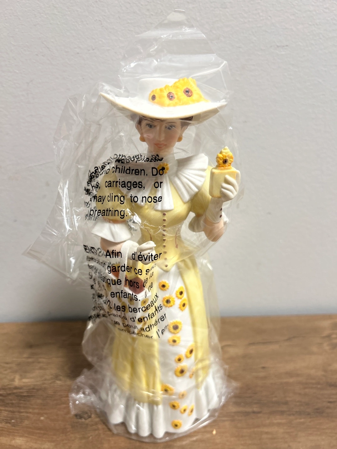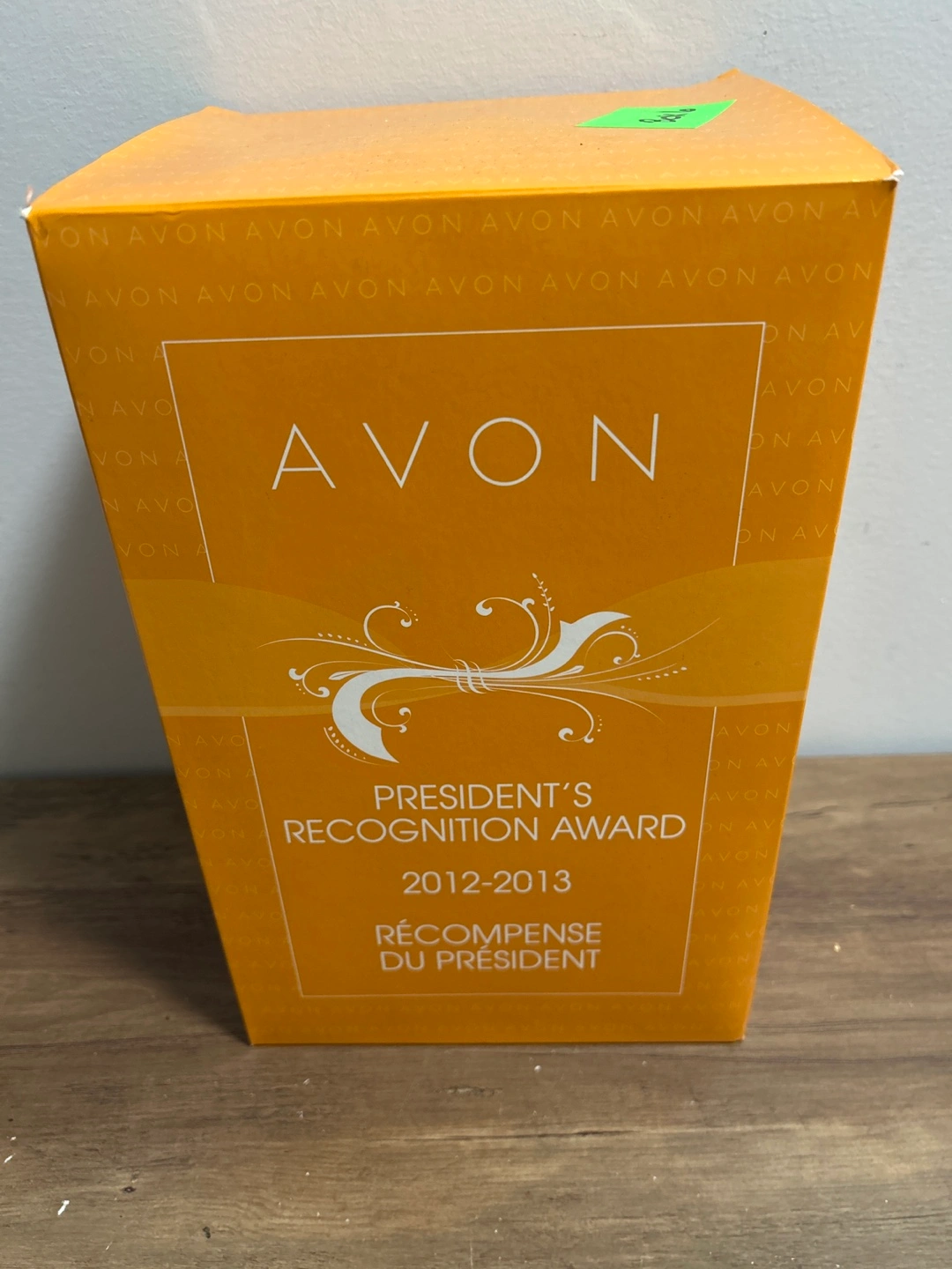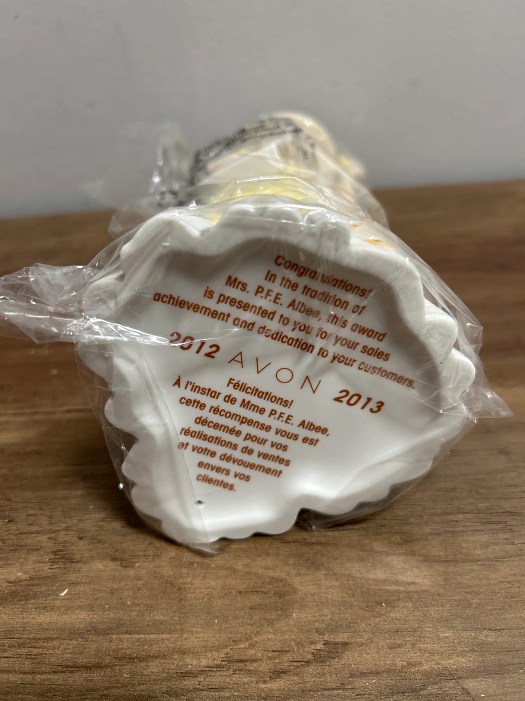 This figurine is from Avon's President's Recognition Award, presented in 2012-2013. It depicts a lady in a yellow dress with sunflowers. It appears to be a ceramic or porcelain collectible. Includes the original box.