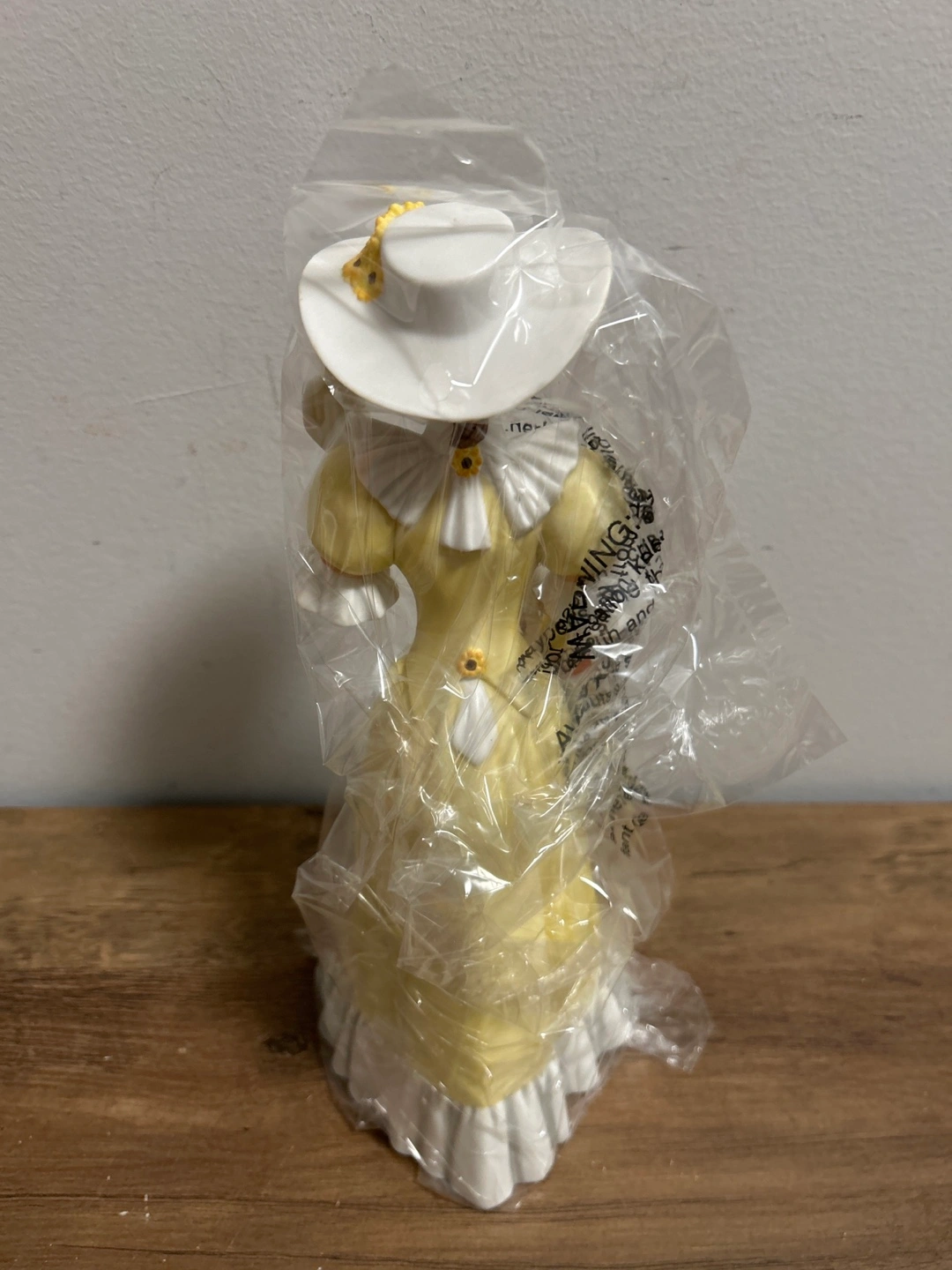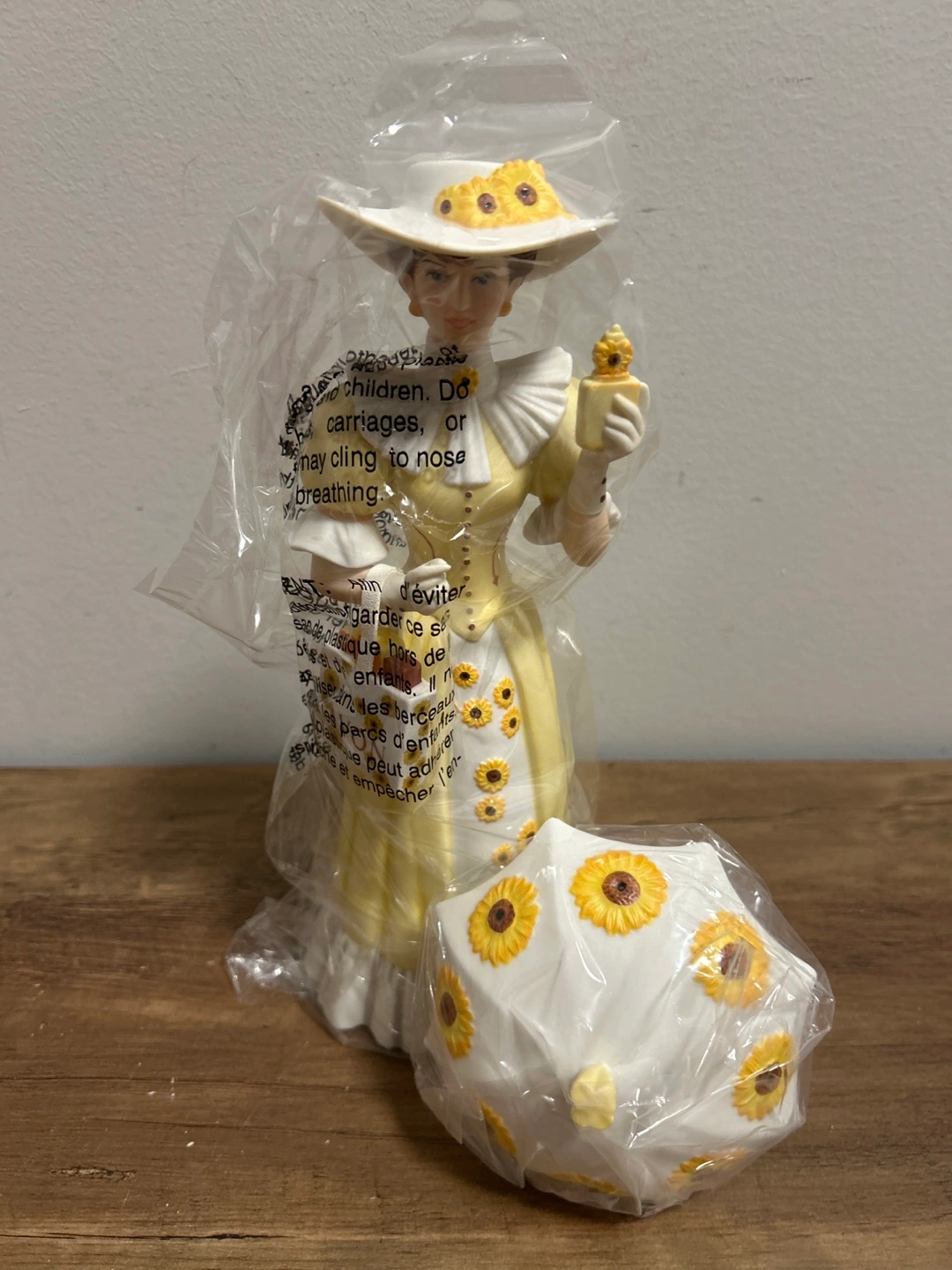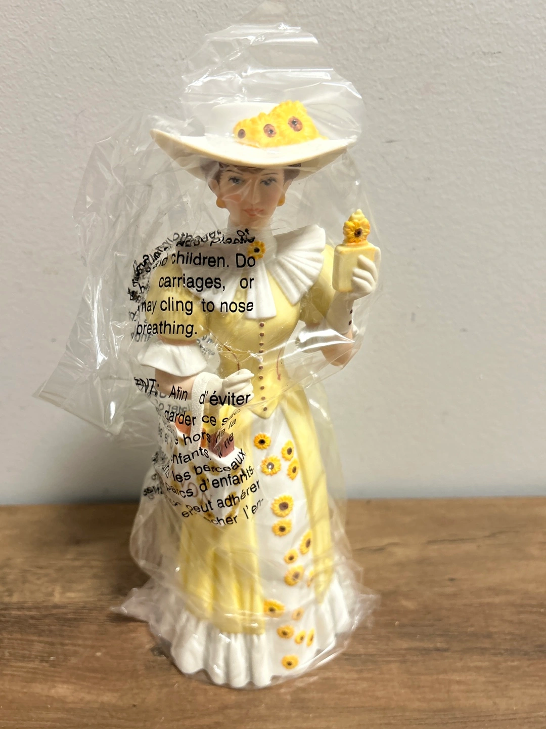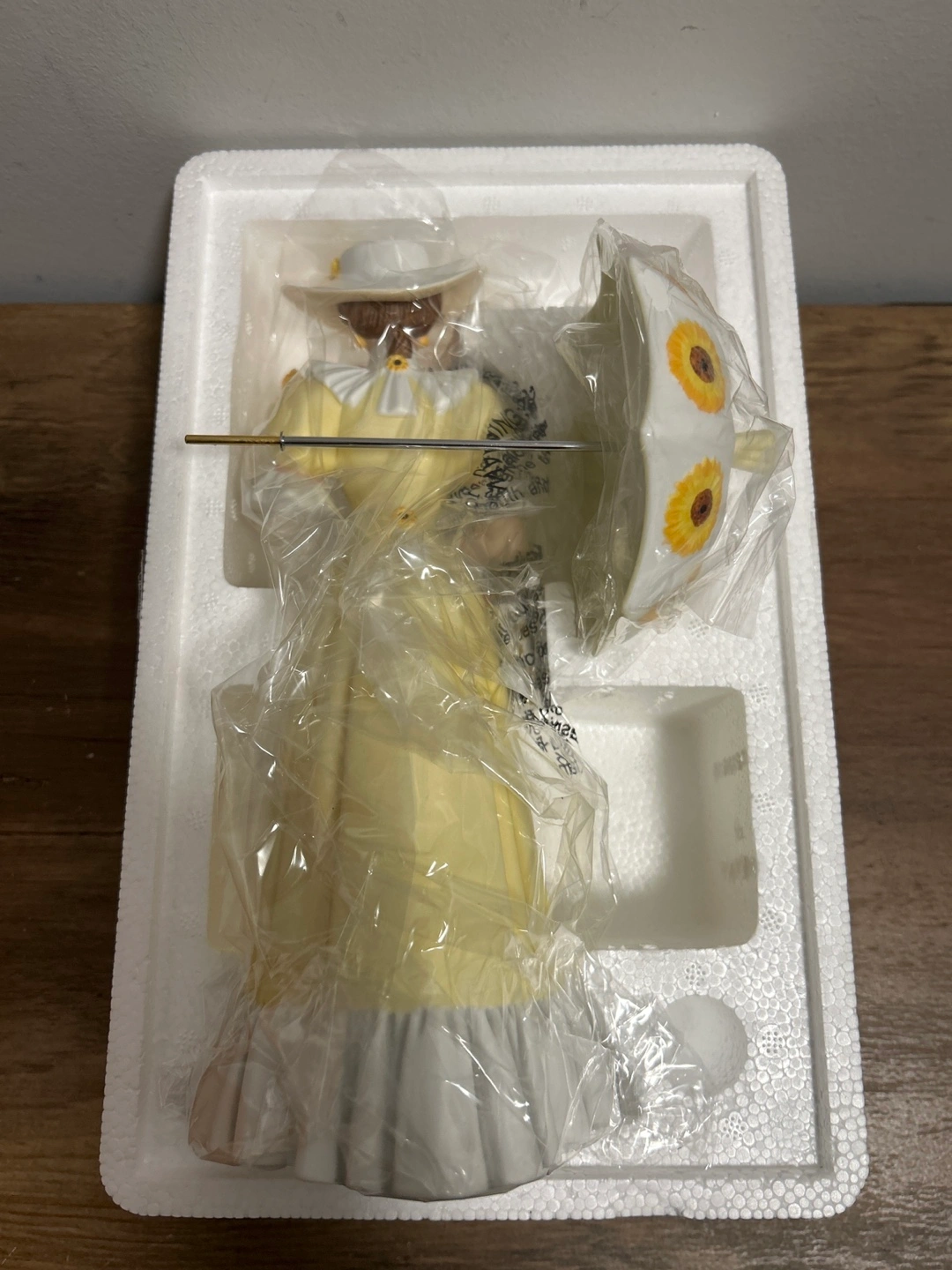 This figurine is from Avon's President's Recognition Award, presented in 2012-2013. It depicts a lady in a yellow dress with sunflowers. It appears to be a ceramic or porcelain collectible. Includes the original box.