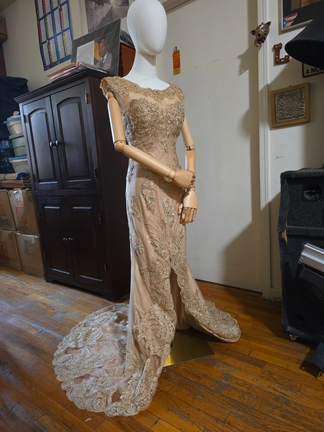 Elegant floor-length gown with intricate beading and lace details. Features cap sleeves and a daring thigh-high slit. Fully lined with a stunning train. Perfect for formal events or galas!