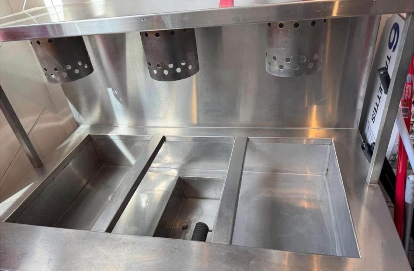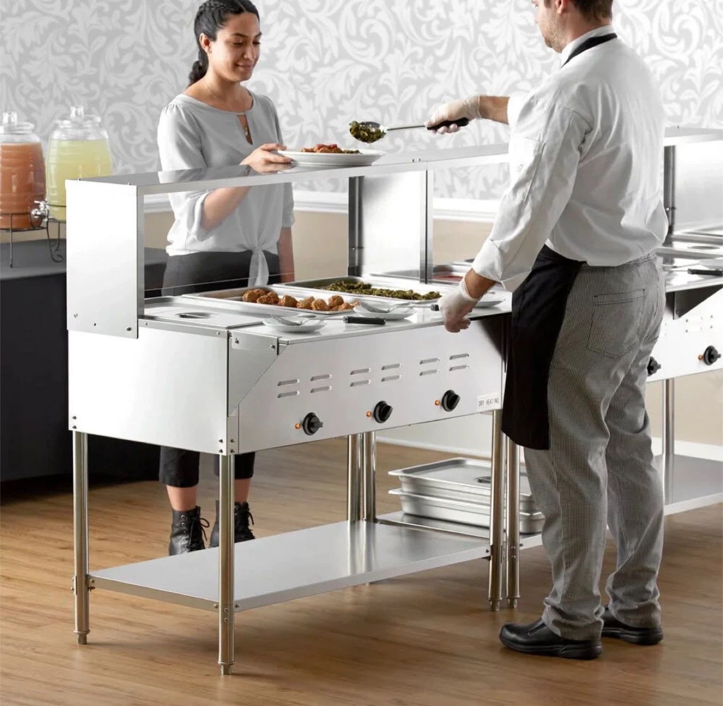 Commercial steam table with three compartments for holding food. Stainless steel construction ensures durability. It comes with utensil holders on top. Great for buffet lines and catering events!