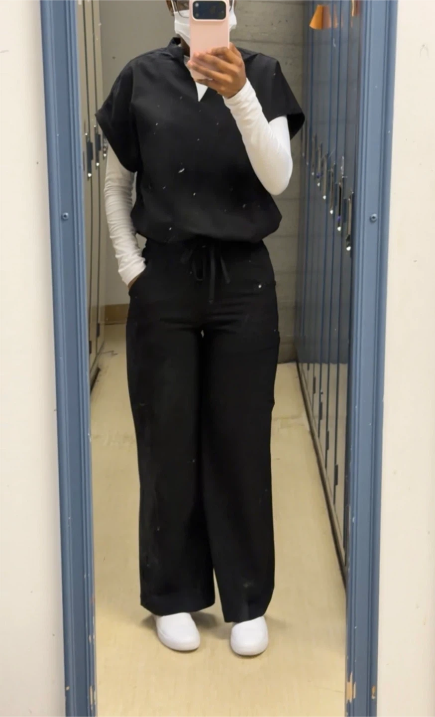 This is a black scrub set including a V-neck scrub top and matching scrub pants. The top has short sleeves and a white undershirt is worn with it. The pants have a drawstring waist and are wide-legged.