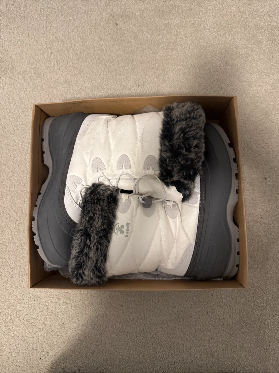 Kamik women's winter boots in white and grey. These boots have a cozy faux fur lining and a waterproof exterior. They come with the original box. Size 8.